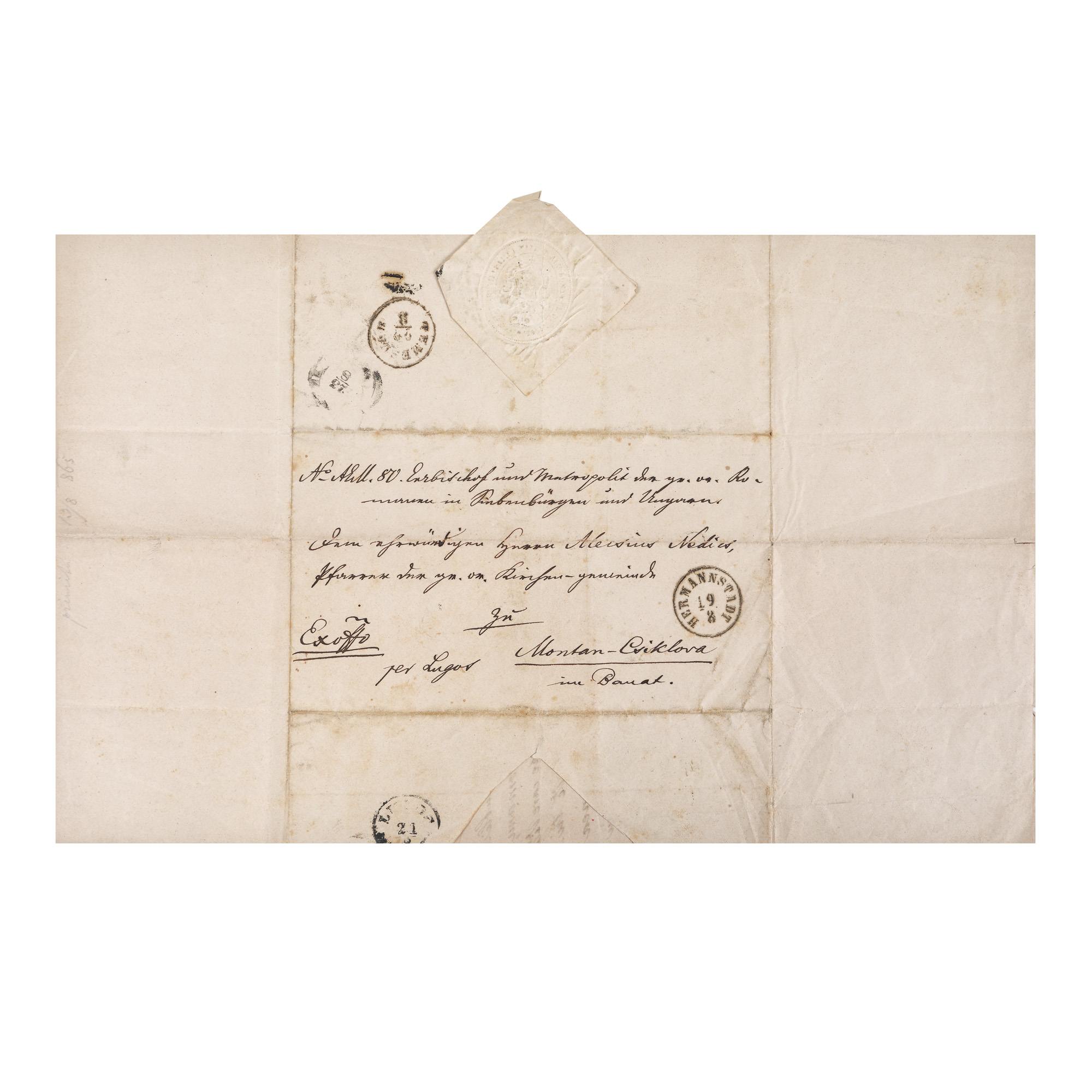 Andrei Șaguna (1808/1809-1873), episcop și apoi mitropolit al românilor ortodocși din Imperiul Habsburgic/Austro-Ungar, a avut un rol major în timpul revoluției de la 1848 din Transilvania, alături de episcopul greco-catolic Ioan Lemeni. Lui Șaguna i de datorează organizarea după 1848 a numeroase școli românești care au avut un rol esențial în păstrarea identității naționale a românilor din Austro-Ungaria. Scrisoarea de față, trimisă de la Sibiu preotului paroh Alesiu Nediciu din localitatea bănățeană Ciclova Montană, se referă la recenta reînființare a Eparhiei Caransebeșului și la chestiuni financiare legate de parohie, cu binecuvântarea și încurajările mitropolitului. Documentul este redactat cu cerneală neagră, datat și semnat olograf de Andrei Șaguna. Pe verso se păstrează ștampilele poștale, precum și timbrul sec al Mitropoliei ortodoxe de la Sibiu. Starea de conservare a documentului este foarte bună.