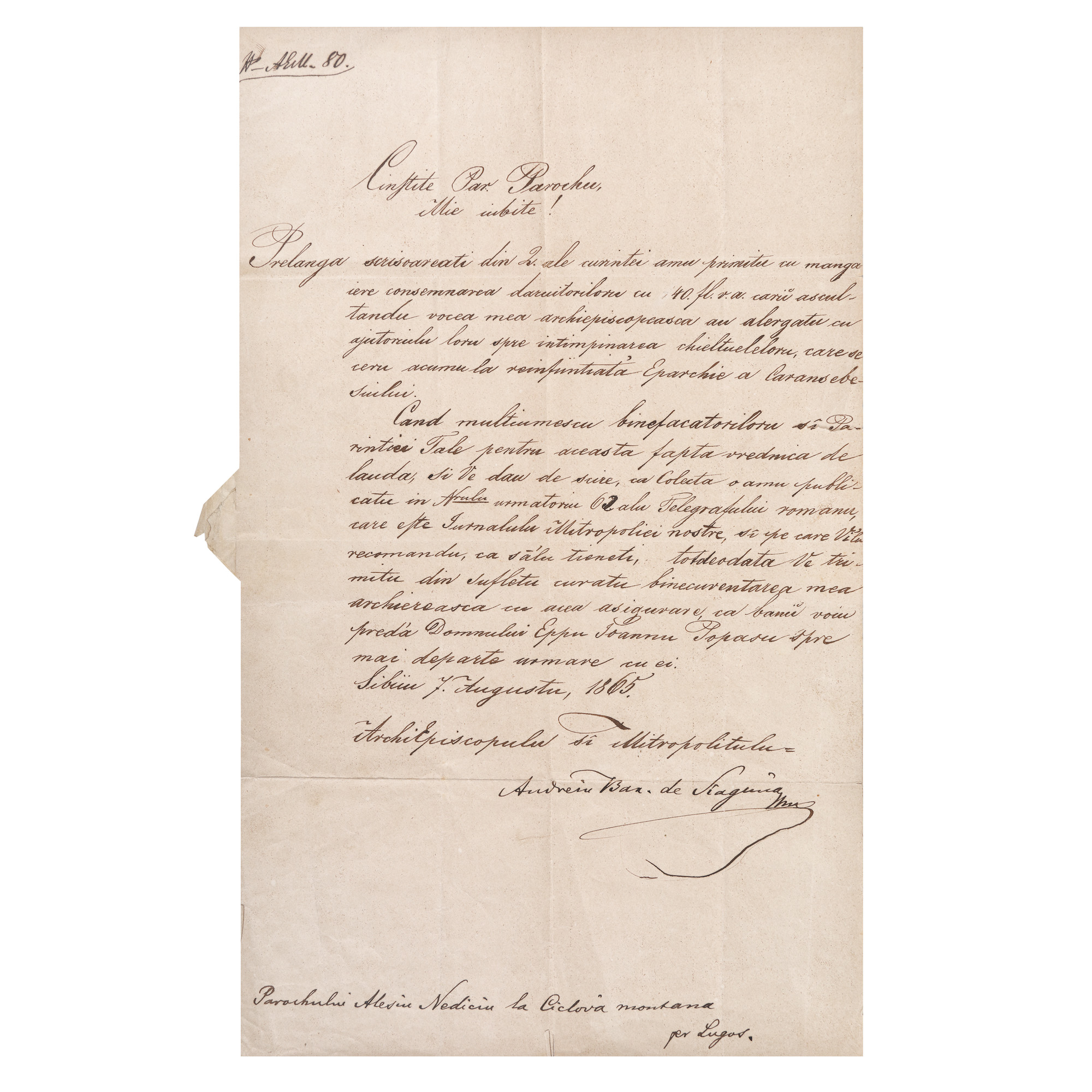64. Scrisoare trimisă de mitropolitul Andrei baron de Șaguna către parohul Alesiu Nediciu, Sibiu, 7 august 1865, piesă rară, de colecție