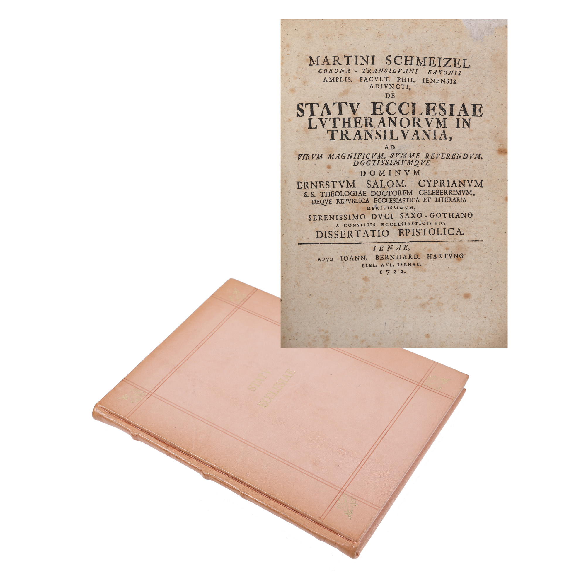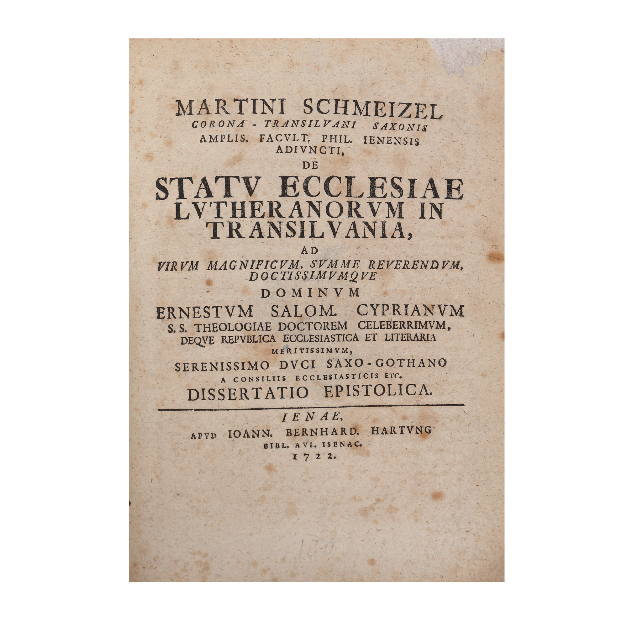 52. "Starea Bisericii Luterane din Transilvania", de Martin Schmeizel, latină, Iena, 1722, piesă deosebită
