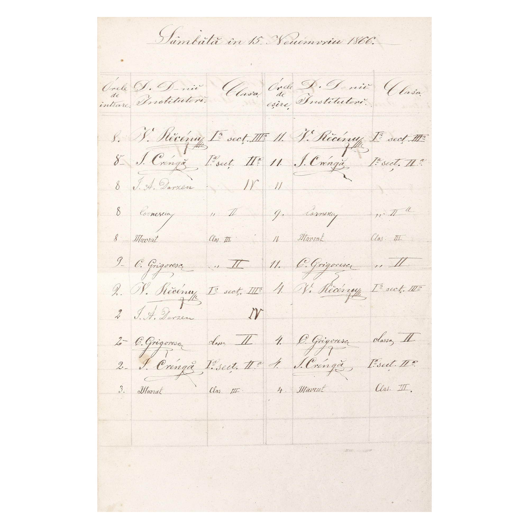 74. Tabel olograf cu semnăturile învățătorilor Ion Creangă, C. Grigorescu și V. Receanu (alături de care realizează primul abecedar românesc modern), 1866