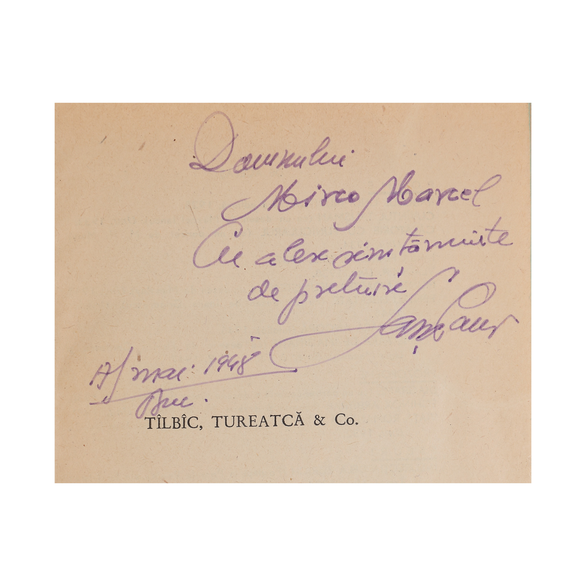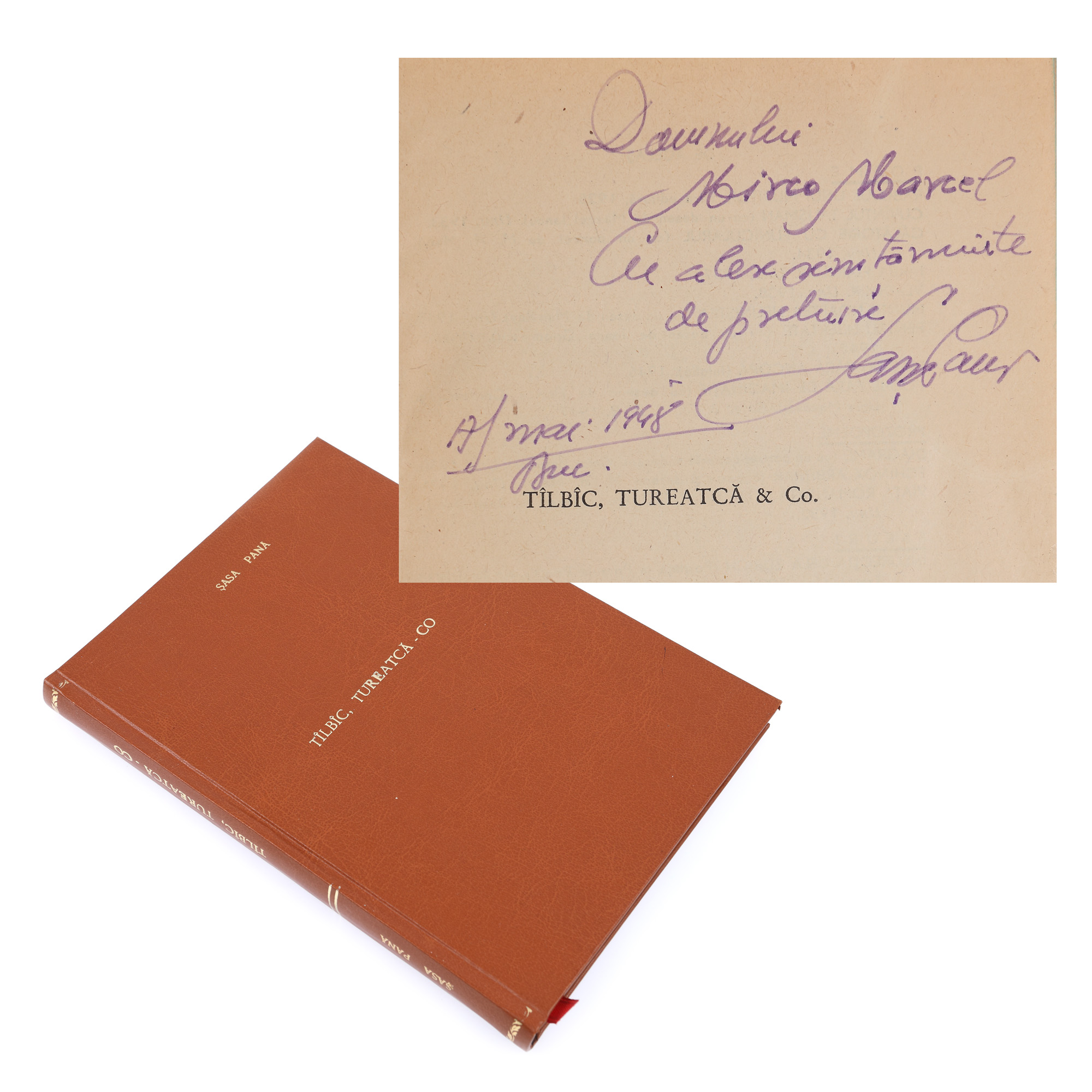 121. ”Tîlbîc, Tureatcă & Co.”, de Sașa Pană, ediție princeps, București, 1948, cu dedicația și semnătura olografă a autorului