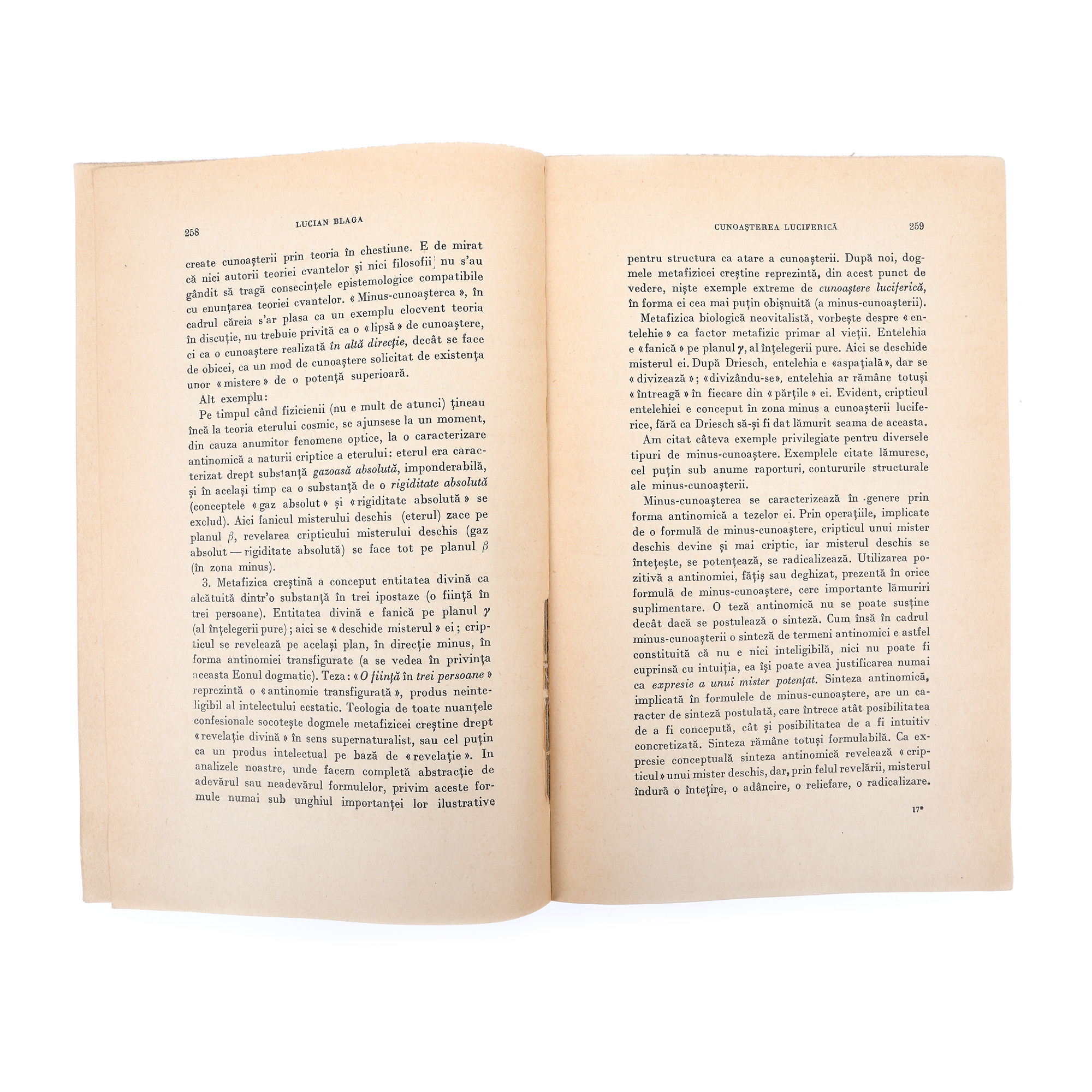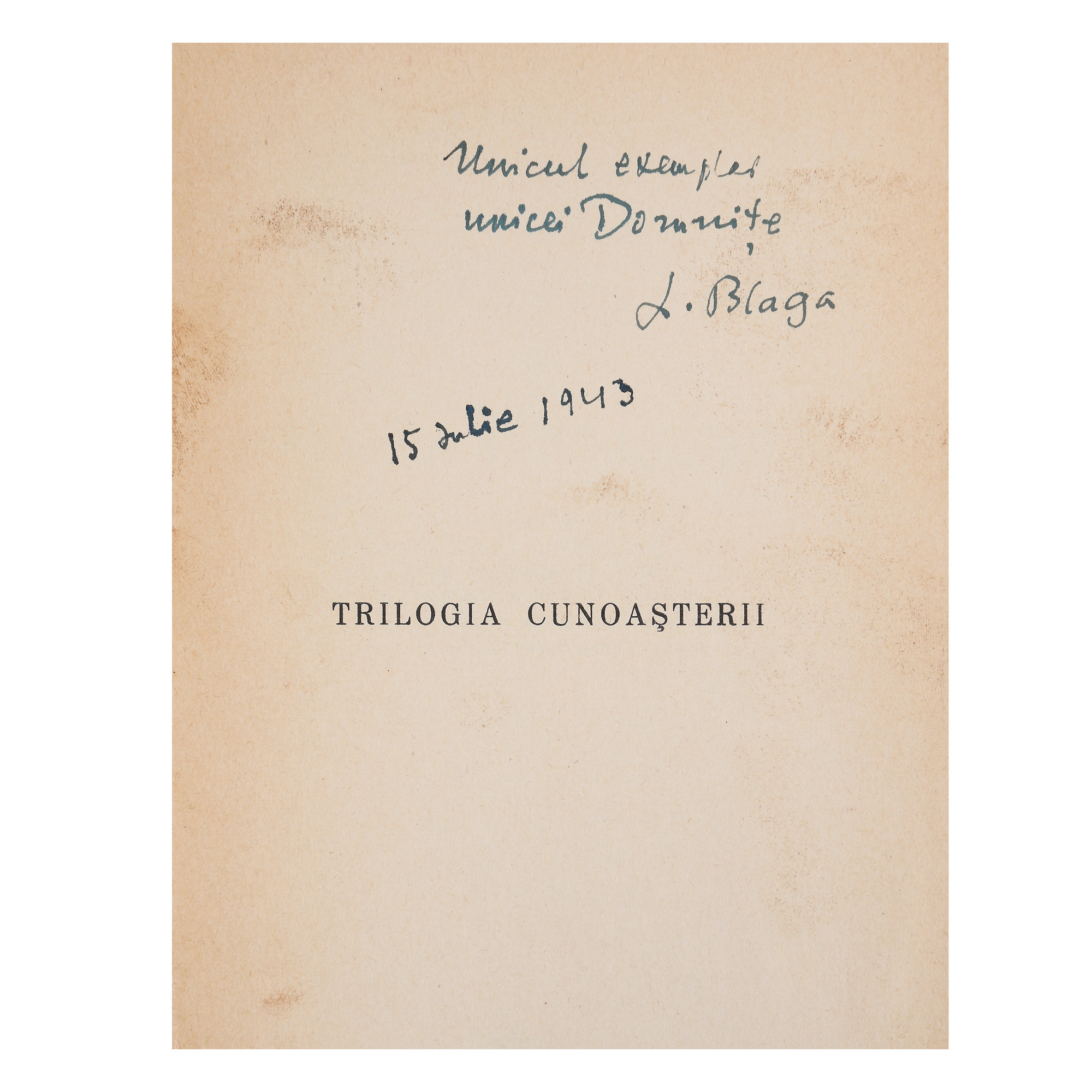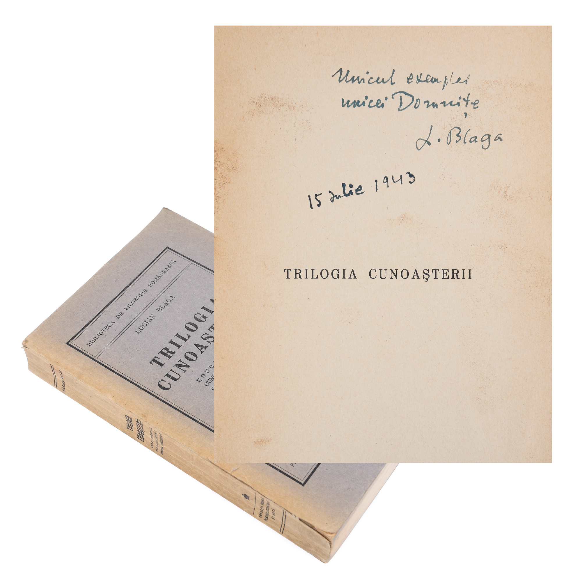 127. ”Trilogia cunoașterii”, de Lucian Blaga, ediție princeps, București, 1943, cu dedicația și semnătura olografă a autorului, provine din colecția scriitorului Vania Gherghinescu