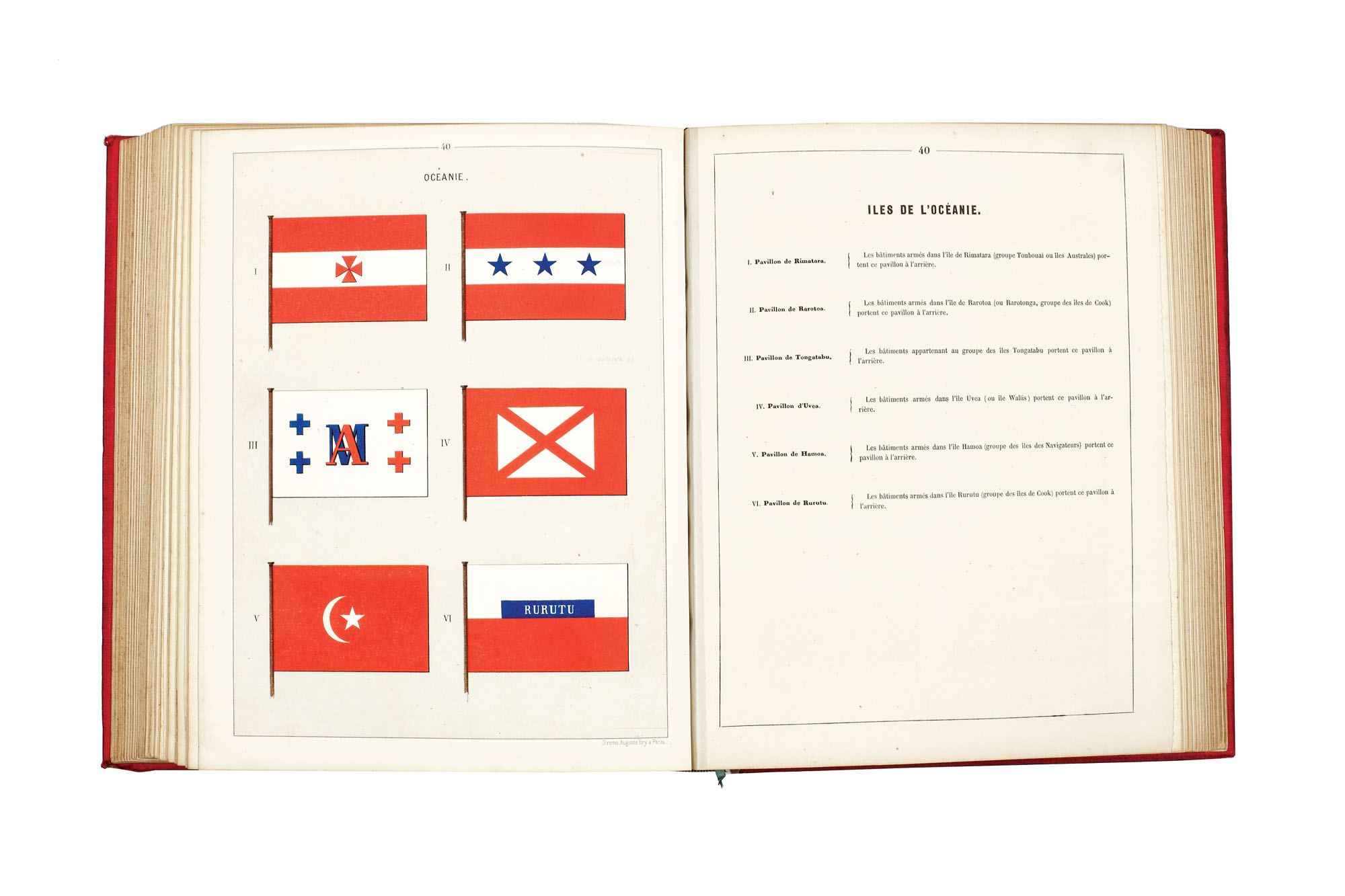 Piesă bibliofilă de colecţie ce conţine 526 de gravuri cromolitografiate ale steagurilor realizate de Auguste Bry, cu descrieri ale fiecăruia. Piesa de faţă este cea mai completă, prima şi singura enciclopedie bine ilustrată a steagurilor ţărilor şi mai ales a celor maritime, incluzând şi flamuri din toată lumea.
