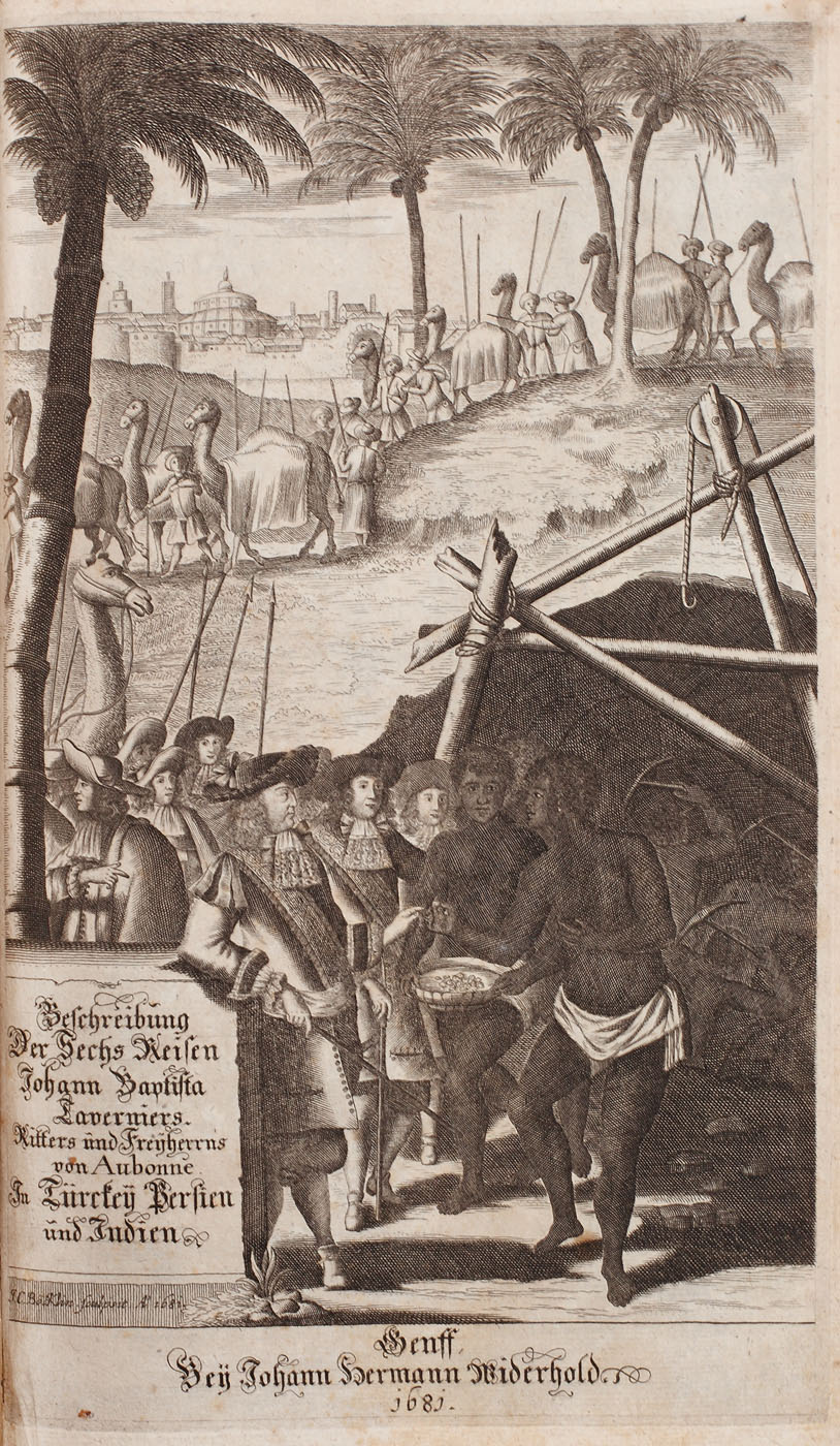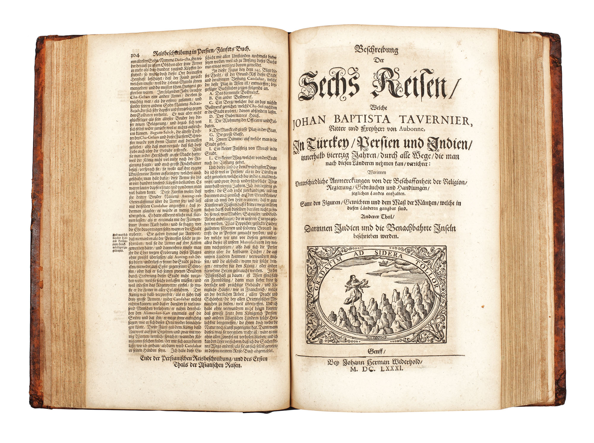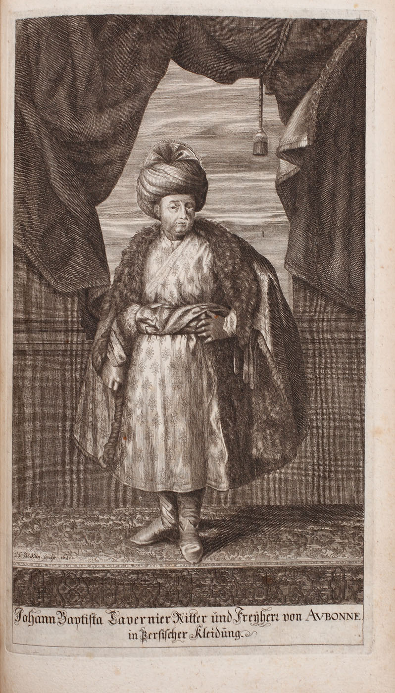 Jean-Baptiste Tavenier a fost un negustor de pietre preţioase şi un explorator francez, provenit dintr-o familie înstărită, care a făcut şase călătorii în Persia şi în India între anii 1630-1668. În anul 1675, Tavenier publică sub patronajul lui Ludovic al XIV-lea, celebra operă "Les Six Voyages de Jean Baptiste Tavernier, Ecuyer, Baron d’Aubonne, en Turquie, en Perse, et aux Indes", urmând să fie publicată şi în limba engleză în anul 1677. Piesa de faţă a fost publicată în anul 1681 la Geneva, în limba germană, aceasta fiind cea mai rară ediţie a cărţii. Tavernier oferă detalii cu privire la spaţiul oriental, acest aspect fiind de mare interes pentru Ludovic al XIV-lea. De asemenea, Tavernier devine cunoscut pentru fabuloasa descoperire a unui diamant albastru, numit apoi, "Tavenier Albastru", de 116 karate, pe care l-a vândut regelui Franţei pentru cinci tone de aur. Acest diamant este prezentat la sfârşitul cărţii de faţă împreună cu alte gravuri unice şi de perioadă realizate de J.K. Böcklin, printre care se numără şi un portret al lui Tavenier în costum otoman.