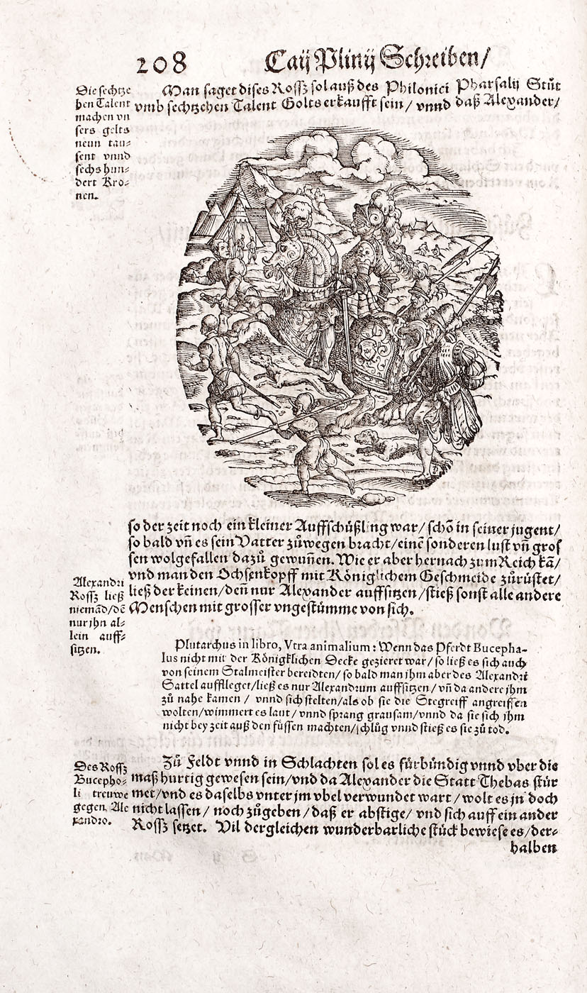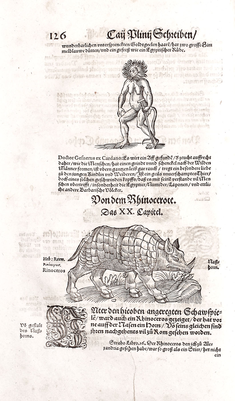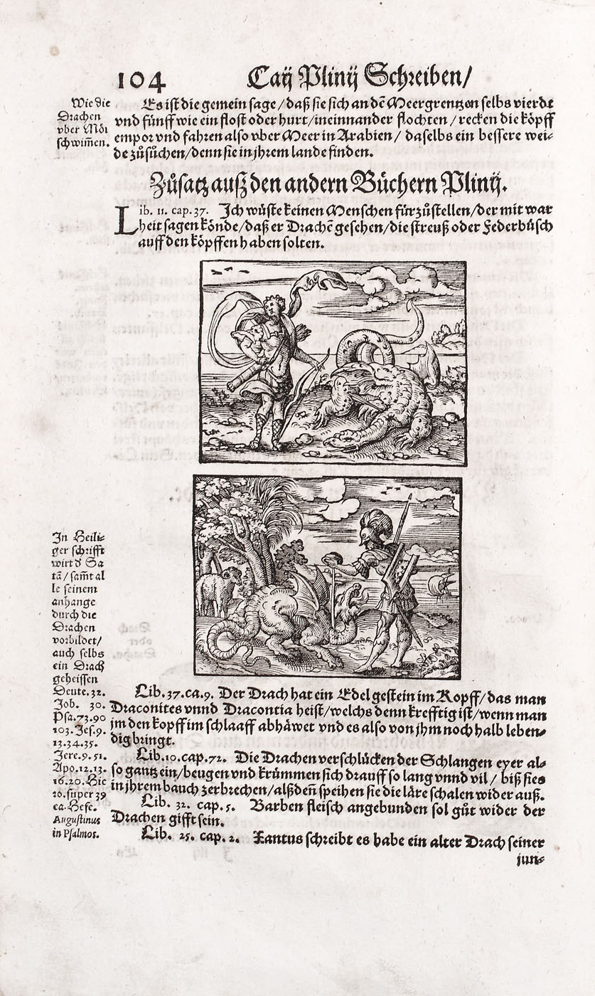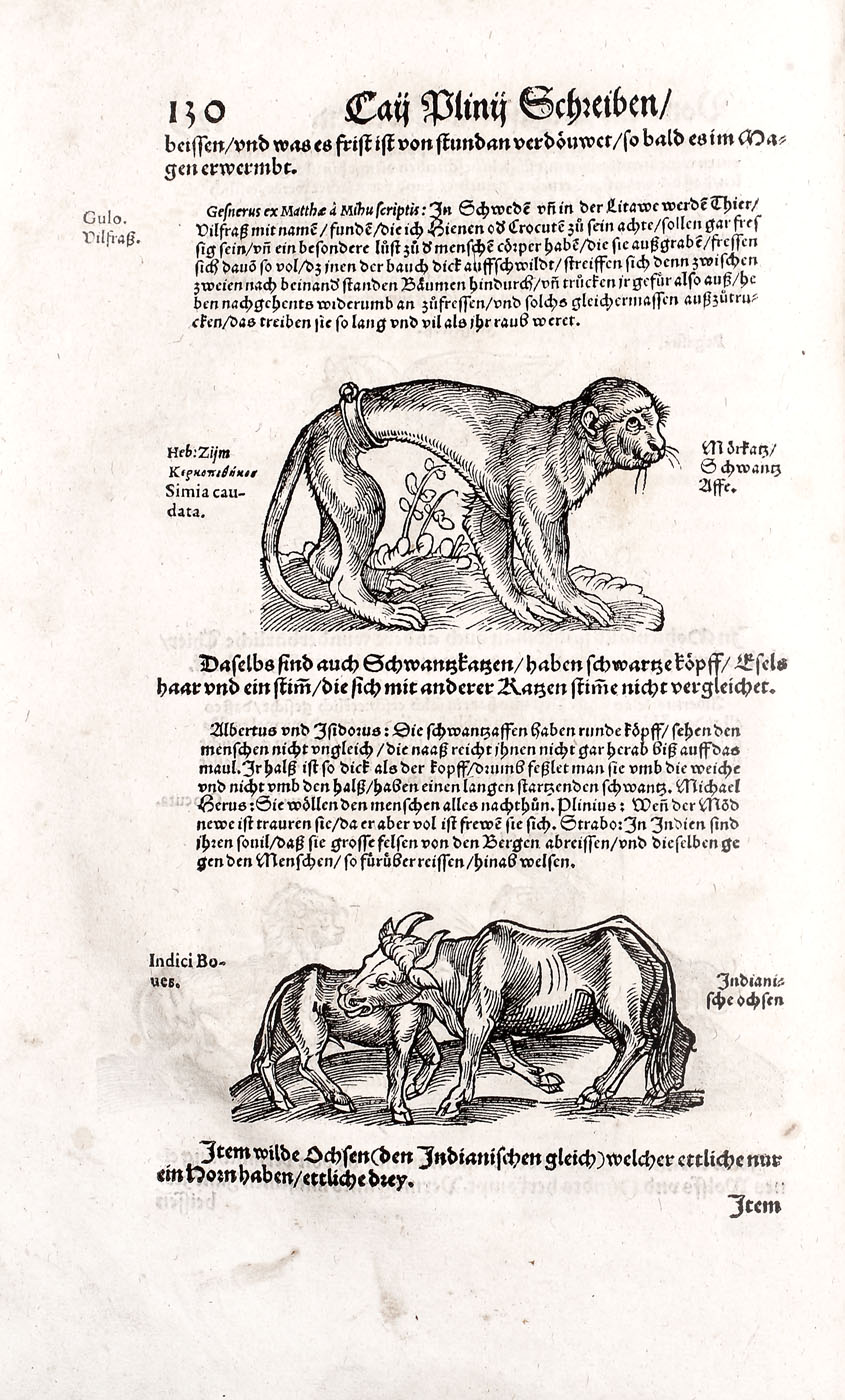 Piesă bibliofilă excepţională, de colecţie, ediţia 1565, prima ediţie germană, a doua fiind publicată în 1584. Conţine 576 de gravuri realizate de gravori germani recunoscuţi, printre care se numără: Hans Weiditz, Virgil Solis şi Jost Amman. Lucrare importantă a lui Plinius cel Bătrân, "Istoria Naturală", a devenit model pentru enciclopedii şi manuale şcolare pentru mai bine de două milenii. Piesa de faţă a fost tradusă în germană de Heyden dezbătând în profunzime subiecte precum antropologia, anatomia şi zoologia. Volumul devine de asemenea un important manual de pescuit şi vânătoare, dar cuprinde şi o parte dedicată şoimăriei. Lucrarea de faţă cuprinde peste 200 de gravuri surprinzând creaturi fantastice printre care se numără şi celebrele reprezentări a sirenei şi a tritonului la paginile 308-309. Volum de 494 pagini, în folio, cu numeroase ilustraţii, legătură in pergament pe lemn, chenare la rece, cotor restaurat, chiotoare de dată recentă. Blocul cărţii în stare foarte bună.