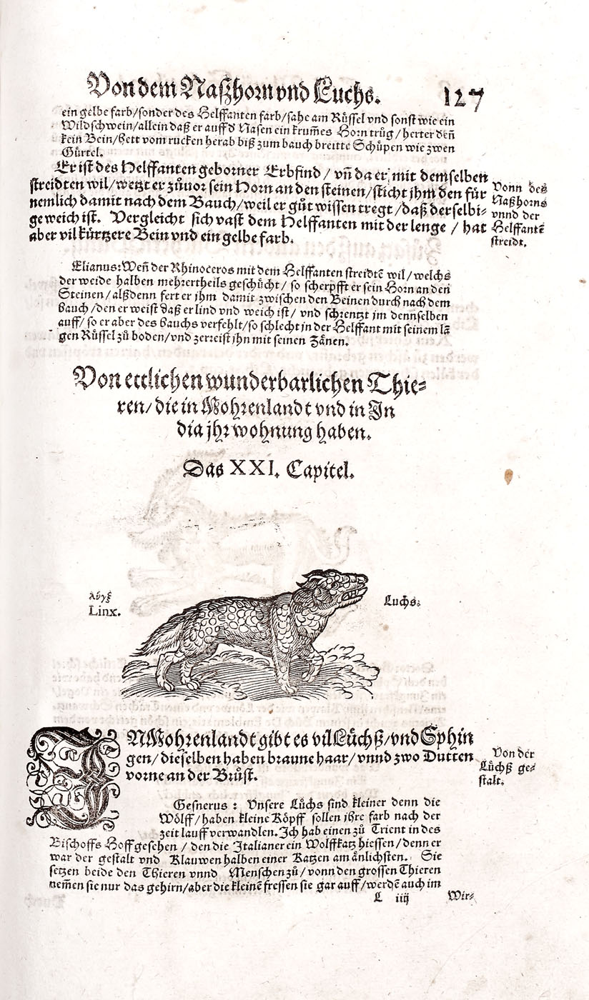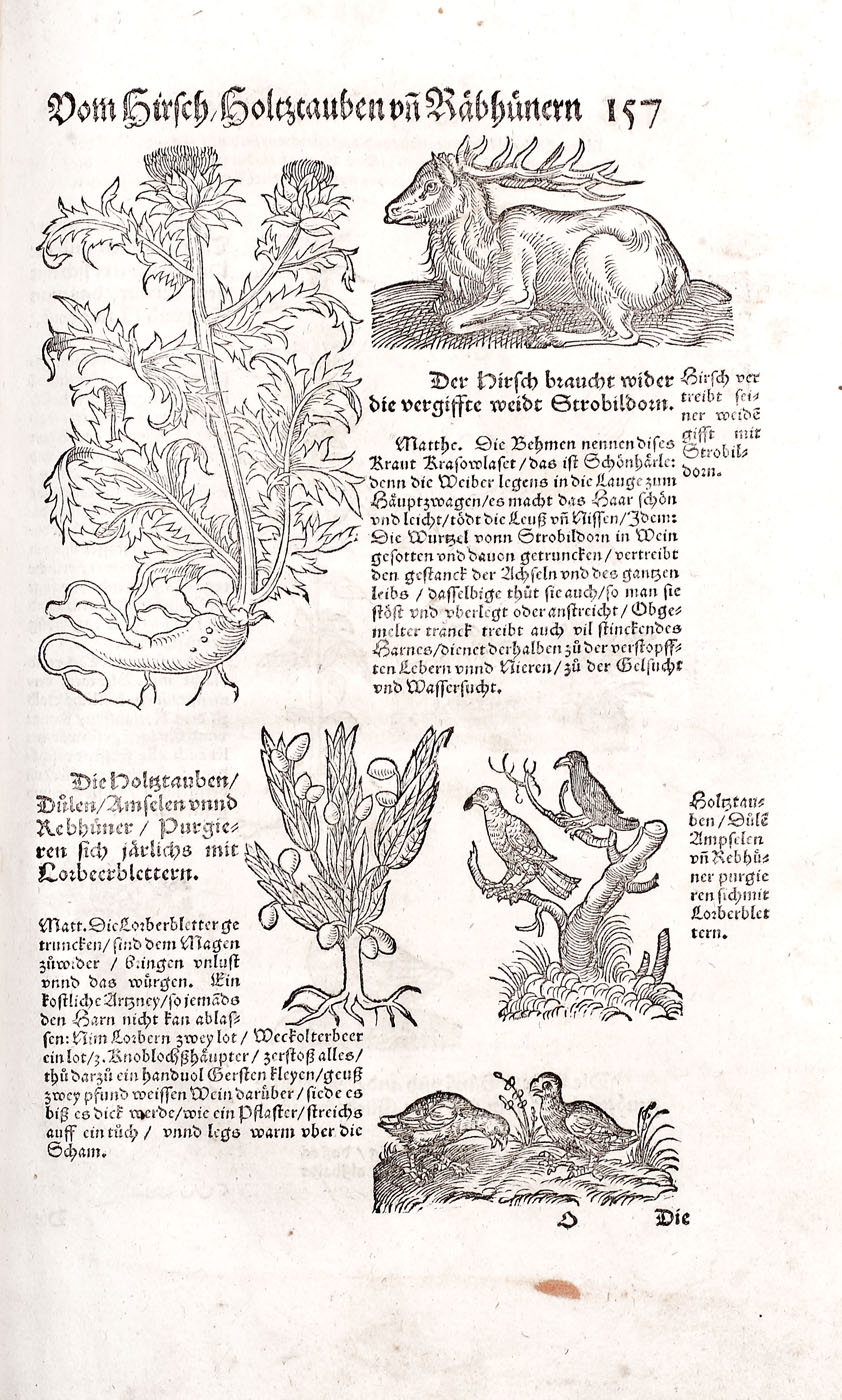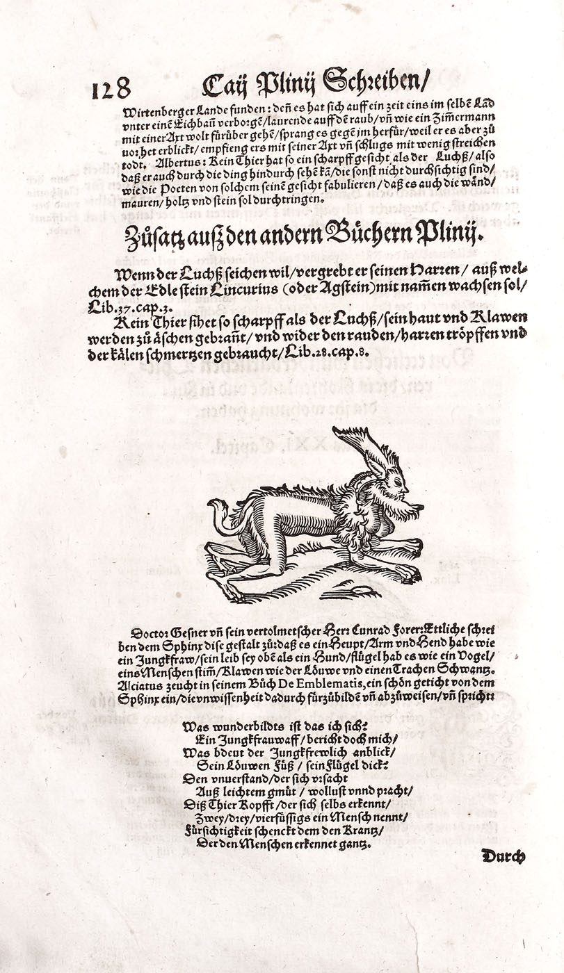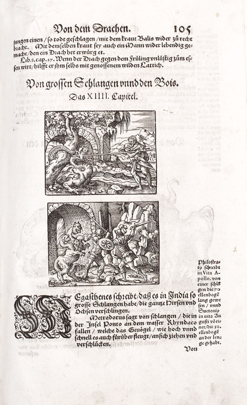 Piesă bibliofilă excepţională, de colecţie, ediţia 1565, prima ediţie germană, a doua fiind publicată în 1584. Conţine 576 de gravuri realizate de gravori germani recunoscuţi, printre care se numără: Hans Weiditz, Virgil Solis şi Jost Amman. Lucrare importantă a lui Plinius cel Bătrân, "Istoria Naturală", a devenit model pentru enciclopedii şi manuale şcolare pentru mai bine de două milenii. Piesa de faţă a fost tradusă în germană de Heyden dezbătând în profunzime subiecte precum antropologia, anatomia şi zoologia. Volumul devine de asemenea un important manual de pescuit şi vânătoare, dar cuprinde şi o parte dedicată şoimăriei. Lucrarea de faţă cuprinde peste 200 de gravuri surprinzând creaturi fantastice printre care se numără şi celebrele reprezentări a sirenei şi a tritonului la paginile 308-309. Volum de 494 pagini, în folio, cu numeroase ilustraţii, legătură in pergament pe lemn, chenare la rece, cotor restaurat, chiotoare de dată recentă. Blocul cărţii în stare foarte bună.