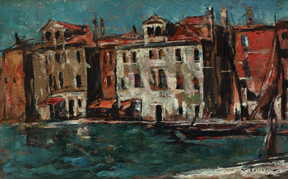 „Viziunea interioară a pictorului s-a suprapus perfect peste peisaj, fără depăşiri şi fără lacune... Atmosfera de taină, în care se complace pictorul, a găsit corespondenţe în faţadele palatelor ce par să închidă, în umbra lor propice, secretul puternicelor pasiuni, pe care le-a adăpostit Renaşterea, crudă şi superbă; gustul înnăscut pentru patină a găsit rezonanţe frăţeşti în tonurile macera­te de vremuri ale somptuoasei cetăţi a lagunelor. De aici acele izbutiri unice, de valoare universală, care îl aşează alături de marii pictori ai Veneţiei şi care fac din «Veneţiile» lui Petraşcu, supremele sale realizări.” (Aurel Vladimir Diaconu) Veneţia a stimulat imaginaţia pictorilor timp de secole, prin claritatea aerului saturat de apă şi cerul mereu senin, Guardi şi Canaletto, reprezentanţii secolului al XVIII-lea veneţian, preocupându-se în mod deosebit de a evoca în imagini oraşul. Primii călători aici fuseseră Dürer şi pictorii flamanzi Rubens şi Van Dyck, urmaţi de El Greco şi Velázquez, romanticul Byron şi generaţia impresioniştilor şi a postimpresioniştilor: Turner, Corot, Manet, Renoir, Signac. Dintre pictorii români, Dărăscu a ilustrat în culori strălucitoare canalele şi palatele Serenissimei, atras de mirajul apei în vecinătatea zidurilor solide. O parte dintre peisagiştii Veneţiei şi-au axat problematica pe transformările care au loc în forma şi materia obiectelor, în funcţie de lumina reverberată în particulele de apă din atmosferă. Petraşcu descrie însă materialitatea gravă şi fastuoasă a oraşului de pe lagună, pe care îl arată în aspectele sale monumentale şi durabile, în ciuda destrămării la care este condamnat prin acţiunea necontenită a apei. Exegeţii operei lui Petraşcu consideră că spiritul său artistic şi-a găsit cea mai bună expresie în peisajul veneţian, întâlnirea providenţială cu oraşul dogilor fiind numită de A. V. Diaconu, citându-l pe Balzac, „l’occasion du génie.”(1) Petraşcu a devenit interpretul ideal al picturalităţii canalelor înguste, cu ziduri roase de intemperii, al culorilor clădirilor şi pieţelor, al ritmurilor arhitecturale ale palatelor. K. H. Zambaccian considera că „nimeni, dar absolut nimeni, nu a pictat Veneţia aşa adevărat ca Petraşcu”(2), numind capodopere ale genului vederile cu Palatele Ca d’Ora, Molibieri, cu podul Rialto, Canal Grande, Casa roşie de la Chioggia sau Curţile Veneţiene. Tot acolo, criticul îşi exprima o previziune despre peisajele veneţiene ale lui Petraşcu, care, spunea el, vor fi căutate, la un moment dat, de către italieni, pentru o galerie de picturi valoroase înfăţişând oraşul. Petraşcu a vizitat Veneţia în nume­roase rânduri, de şapte ori doar până în 1929, opera sa numărând peste 150 de picturi inspirate de oraş şi de împrejurimile sale. Sentimentul care îl cuprindea în faţa oraşului dogilor era unul de factură romantică, el văzând – asemenea lui Eminescu, căruia îi purta o adâncă admiraţie – Veneţia ca o necropolă în care se păstrează urmele strălucirii unei lumi apuse, ruina macerată de timp şi intemperii a unui oraş fastuos. George Călinescu remarca „... dramatice privelişti veneţiene ale lui Petraşcu, cu mult mai profunde decât ale lui Canaletto, descompuneri în culori grele şi somptuoase a unui cadavru de oraş.”(3) La crearea impresiei sale a contribuit probabil repertoriul său de motive, din care lipsesc imaginile sărbătoreşti, de carnaval, gondolele, velele, sau mulţimile multicolore, cuprinzând în schimb case vechi cu ziduri scorojite, pe care le găseşte de-a lungul canalelor înguste, relicve ce nu mai păstrează nimic spectaculos. „Case la Chioggia”, o vedere de pe unul dintre canalele centrale ale oraşului din sud estul Lagunei Veneţiene, ilustrează aliniamentul clădirilor impunătoare ale vechiului oraş pescăresc, cu fastul lor de odinioară şi arătând semne ale decrepitudinii. Arhitectura, deşi mai simplă decât a palatelor veneţiene, păstrează linii elegante în unele elemente precum ferestrele cu arcadă sau foişoarele din vârf. Culorile zidurilor aduc, pe lângă aerul vetust, şi o notă de lux, Petraşcu transfigurând igrasia şi tencuiala îmbătrânită într-o patină preţioasă. Apa, reprezentată în nuanţe multiple, devine consistentă, oglindă minerală, la fel cum şi cerul pare alcătuit dintr-un material smălţuit. Pictura este dominată de o atmosferă de linişte şi reculegere, evocând aspectele calme, stabile, ale realităţii şi tăcerea materiei minerale din care este alcătuită lumea lui Petraşcu. "În tablourile din 1928 - Interior de palat venețian din colecția avocat N. Trestianu, Case la Veneția din colecția K. H. Zambaccian sau cele două Case la Veneția din colecția ing. L. Laserson - acordurile cromatice sunt mai luminoase, mai prețioase. Dantelajul alb al ferestrelor și balcoanelor, tonurile roz ale caselor, albastrul transparent al cerului, îmbinările de verde, roșu, alb al apei, siluentele negre ale bărcilor, bogăția nesfârșită de nuanțe, toate arată o îmblânzire, o îmbelșugare a paletei." (Ionel Jianu, Fundația Regele Mihai I, București, 1945, p. 50) 1 A. V. Diaconu apud Eleonora Costescu, „Gheorghe Petraşcu”, p.82 2 K. H. Zambaccian, „G. Petraşcu”, p.21 3 George Călinescu apud Vasile Florea, „Petraşcu”, p.65