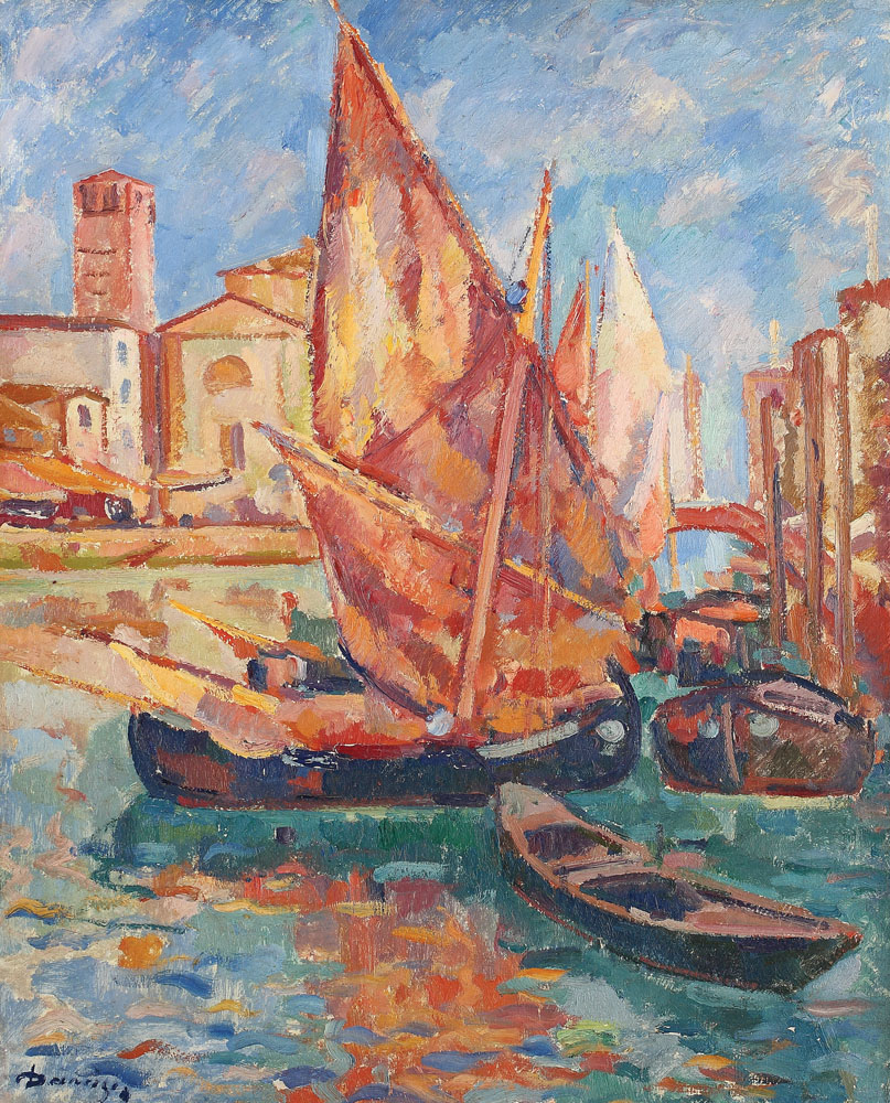Dărăscu ajunge în deceniul al treilea al secolului trecut să fie recunoscut drept unul dintre cei mai reprezentativi artişti în manieră impresionistă autohtoni. Drumul parcurs de pictor a produs totuşi altă apariţie a sa în întregul tablou plastic românesc. Desigur că secretul din spatele dezvoltării artistice se regăseşte în acumularea succesivă a diverselor influenţe, căpătate atât în timpul studiilor cât şi ulterior. Spre exemplu, pentru a înţelege calităţile de desenator ale lui Dărăscu ar trebui să căutăm în biografia sa momentele în care, la Şcoala de Arte Frumoase din Bucureşti, participa cu înfocare la lecţiile de desen ţinute de pictorul Dimitrie Serafim. Dărăscu alegea această parte a cursurilor şi din cauza faptului că lecţiile de pictură primite de la Mirea sau Strâmbu nu rezonau cu propriul eu artistic, cu atât mai mult cu cât în epocă rămânea profund impresionat de arta lui Luchian, diametral opusă de plastica celor doi profesori mai sus menţionaţi. Înaintând în biografia artistică, putem înţelege de ce perioada pariziană surprinde câteva momente moarte, determinate de încercările succesive de regăsire într-un mediu academic bogat. În atelierul lui Jean Paul Laurens, la Academia Julian, şi apoi în cel al lui Luc Olivier Merson de la Académie de Beaux-Artes din Paris, Dărăscu se loveşte de limitarea constituită de pictura în atelier, simţind încă din perioada 1906-1907 că adevărata sa vocaţie era natura şi mai ales mediul acvatic. Acest lucru nu este determinat doar de abundenţa Veneţiilor ce definesc arta sa de maturitate, ci chiar putem identifica o ciclicitate în tabloul estetic în ceea ce priveşte motivul marin, în concepţie largă. Descoperirea portului Saint Tropez conturează practic prima perioadă cu adevărat valoroasă în arta lui Dărăscu, care coincide şi cu schimbarea manierei plastice. Împroprietărirea pointilismului, ca răspuns la interogaţiile ce ţineau de culoare şi construire a materiei, se consumă prin pictarea portului mediteranean. A treia instanţă acvatică pe care o putem identifica în universul pictural dărăscian este constituită în jurul motivului autoh­ton, Dobrogea fiind scrutată excesiv de ochiul format al pictorului totuşi născut pe malurile Dunării. În continuarea analizei acumulărilor stilistice, pointilismul este una dintre pietrele de hotar ale carierei lui Dărăscu, dar nu numai din prisma calităţii operelor acestei perioade, ci mai ales din pricina schimbărilor suferite în cadrul uneltelor picturale. Legile optice, atât de dezbătute de grupul neoimpresioniştilor din jurul lui Signac, produc schimbări majore, de lungă durată, atât în paletă, dar mai ales asupra senzorialului, element definitoriu pentru un pictor al naturii. Alături de legea contrastului simultan, Dărăscu descoperă şi acceptă programul foviştilor, iar arta lui Matisse constituie elementul ce echilibrează căutările pictorului. Astfel, tabloul se completează, iar tehnica culorilor, desenul, optica se orânduiesc logic, sub haina supremă a compoziţiei, drept arta de a ordona toate elementele de care un pictor dispune, într-o manieră revelatoare propriului eu artistic. În timp, Dărăscu aprofundează din ce în ce mai mult paleta cromatică, pornind de la principiile neo-impresioniştilor, dar se va opri, nu o dată şi la răspunsurile oferite de arta lui Cezanne. Astfel, putem observa şi în lucrarea de faţă aplecarea spre tonalitatea generală albastră, atât de necesară şi unitară în universul peisajelor marine, împrumutată de altfel de la maestrul francez. Începând cu anii ’20, Dărăscu reuşeşte să îşi adapteze stilul la necesităţile rezolvării problemelor ce ţin de construirea volumelor. Culoarea guvernează întreaga compoziţie, iar suprafeţele sunt coordonate exclusiv de volumele pictate. Însă complexul cromatic dezvoltat este şi el supus procesului de epurare. Culoarea îşi pierde din consistenţa pură cu care era folosită în primele perioade, iar contrastul devine unealta unei game cromatice aprofundate. Paleta se esenţializează, până în punctul în care putem observa în peisajele lui Dărăscu, în special în cele din perioada 1926-1928, o bivalenţă cromatică, modelată în jurul galbenului şi roşului. Desigur că întregul complex cromatic este subordonat tonurilor de albastru, mai ales în cazul Veneţiilor realizate în această perioadă, ştiindu-se faptul că peisajele lui Dărăscu sunt mereu coordonate de consistenţa apei. Ca şi în lucrarea noastră, apa primeşte încărcătură materială, ca de altfel toate suprafeţele surprinse. Acest lucru este determinat de preocuparea lui Dărăscu de a construi formele şi volumele în culoare, direct din tuşa penelului, oferind întregii imagini calităţi plastice accentuate. În construirea vederii veneţiene Dărăscu porneşte mereu de la colţurile ce au trezit interes vizual, şi chiar dacă repictează acelaşi colţ de mai multe ori, niciodată nu se întâlneşte aceeaşi pregnanţă picturală. Peisajul îşi pierde din calităţile de pur motiv pictural, deoarece acesta resimte o mutaţie în valorificare, metodele cromatice fiind astfel încărcate de importanţă. Astfel locurile alese de pictor au doar menirea de a oferi primul strat vizual şi desigur că trebuie să ofere și elementele propice unei reproduceri, efectul de lumină sau o perspectivă generoasă şi atrăgătoare. Zona în care canalul trece pe lângă Torre dell’Orologio devine punct de interes în mai multe opere ale lui Dărăscu, în special la cele din perioada 1926-1928, cea mai revelatoare a Veneţiei pe de-a-ntregul. Probabil că imaginea surprinsă în lucrarea noastră este realizată chiar din barca pictorului, ancorată pe puntea ce se continuă spre celelalte vase acostate. În tuşe generoase de galben şi roşu, în conexiun