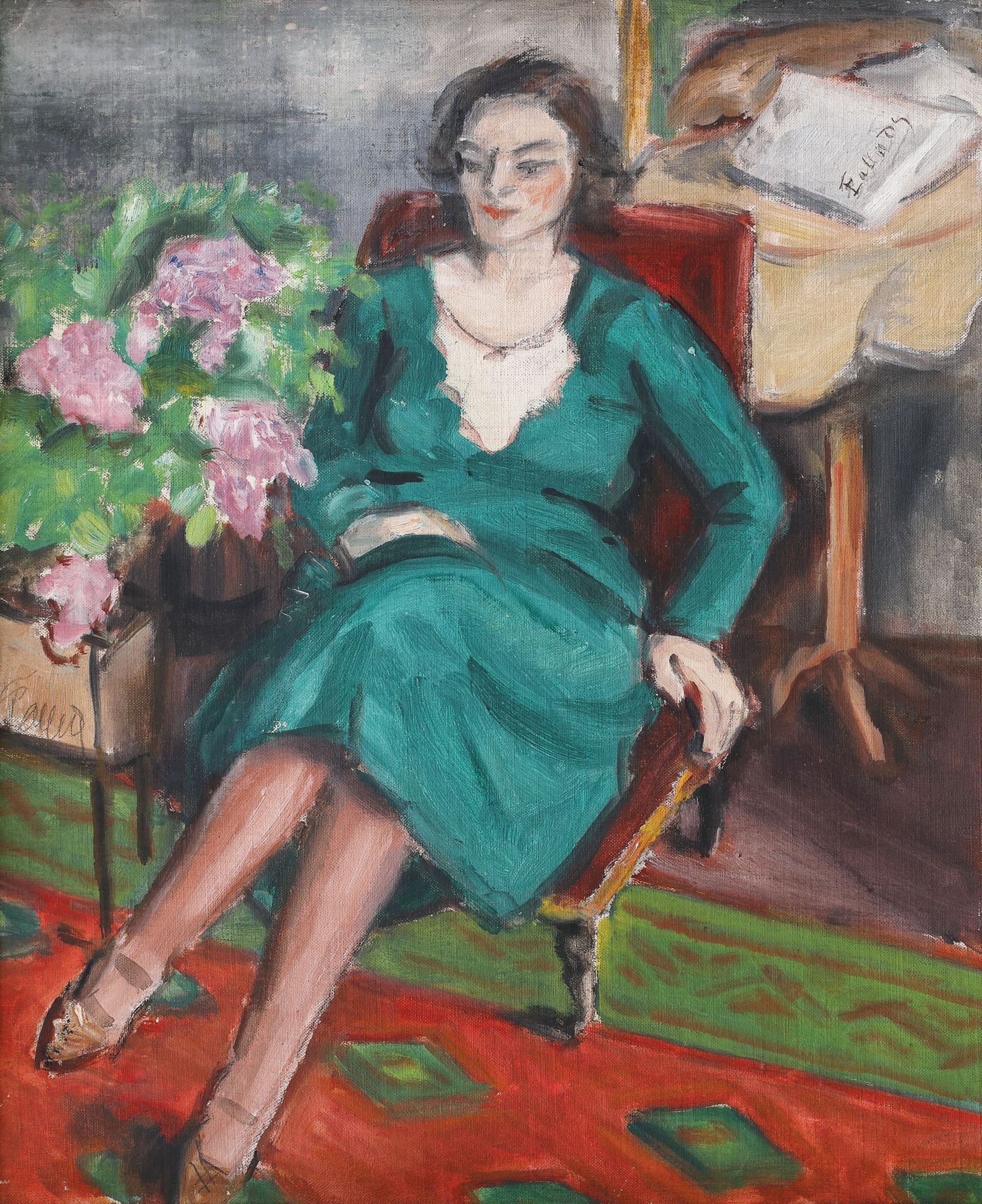 Este bine cunoscută pasiunea aproape clinică a lui Theodor Pallady pentru notițe, jurnale sau diverse însemnări, "grafomania" acestuia reușind să ajute cercetătorii creației sale să descifreze opera sa mai amănunțit. Pe lângă semnături multiple, aplicate pe recto-ul lucrărilor sale, deseori identificăm pe verso-urile acestor picturi (în special), alte însemnări olografe, intrinsec legate momentul creației, al motivului sau al expunerii ei în epocă. Cifrurile folosite de Pallady, diverse litere, aparent aleatorii, rezultă de cele mai multe ori din plăcerea acestuia pentru organizare, iar mai târziu, drept o anexă la jurnalul ținut, în special în ultima parte a vieții, după reîntoarcerea definitivă în România (sfârșitul anului 1939). Z, P, D, X sau E însoțesc operele lui Pallady și "trădează" fărâme din personalitatea pictorului. În cazul literei Y, ce însoțește pictura de față, presupunerea cea mai validă ne spune că reprezintă inițiala numelui partenerei lui Pallady, Yvonne (Cousin), cea pe care o pierdea în 1939. Litera avea să însoțească toate operele prezentate de artist la prima expoziție personală de după decesul lui Cousin, expoziție din cursul anului 1940 și ar fi reprezentat un omagiu adus partenerei sale încă din timpul anilor '30, când apare cifrul prima dată. Astfel, descoperim în "doamna în verde", pictată într-o atmosferă personală, pe un fotoliu de epocă, într-o postură relaxată, pictura cu numărul 24 expusă de Pallady în 1940. Pictată cel mai probabil în prima jumătate a anilor '30, opera ne introduce în tipicul interior parizian, al atelierului din Place Dauphine, loc în care artistul a creat nenumăratele compoziții ce îl definesc astăzi în pictura modernă românească.