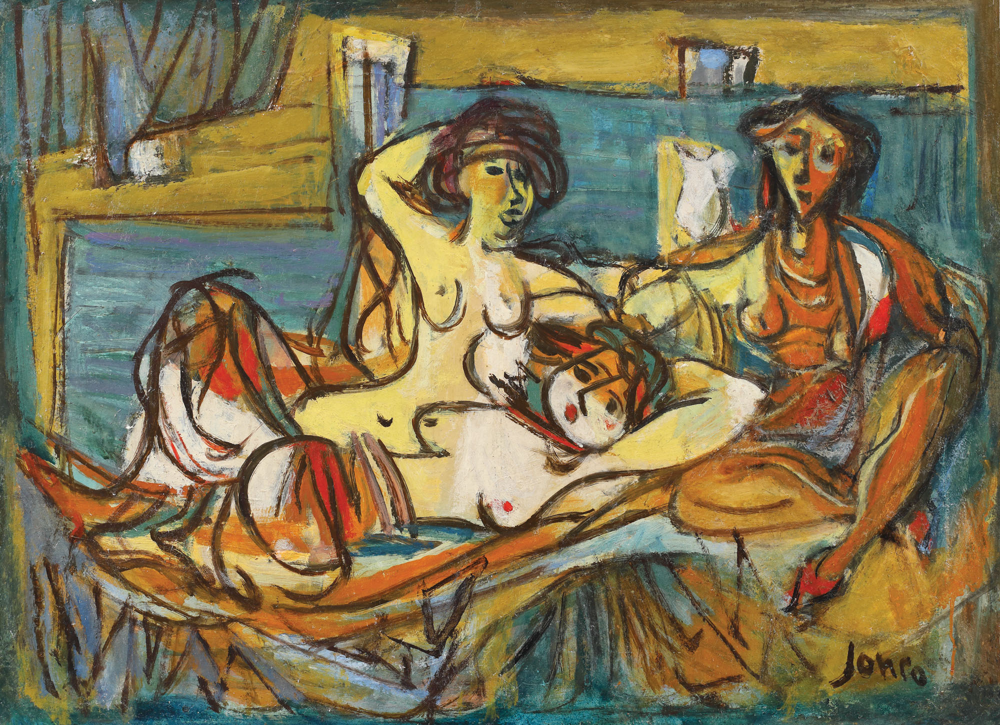 În 1930, Marcel Iancu (Janco) era la apogeul carierei sale. Tocmai se întorsese în România din Zurich, unde îşi efectuase studiile de arhitectură şi unde fusese unul din fondatorii grupului DADA Zurich, respectiv din Franţa, unde lucrare ca arhitect pentru reconstituirea clădirilor din ruinele Primului Război Mondial. În România, alături de prietenul său Ion Vinea, a pus bazele revistei “Contimporanul”, platformă pentru toate grupurile de avangardă din Europa. Alături de fratele său, Jules Janco, a pus bazele şi a lucrat ca architect modernist în cadrul firmei de arhitectură “Fraţii Iancu”, punând bazele unei reputaţii internaţionale, care persistă până azi. În acelaşi timp, a lucrat asiduu la unele din cele mai notorii lucrări de artă, expuse atât la Saloanele bucureştene, cât şi în galeriile şi muzeele din străinătate. Lucrarea curentă înfăţişează tinere femei nud, atractive, în postura de modele în atelierul artistului. Ele sugerează o aparentă încredere în propria frumuseţe şi atractivitate; o lucrare rară ce transmite o stare de spirit, un joie de vivre, în vremuri prospere şi optimiste. (Michaela Mende Janco, nepoata artistului şi manager al Fundaţiei Marcel Janco)