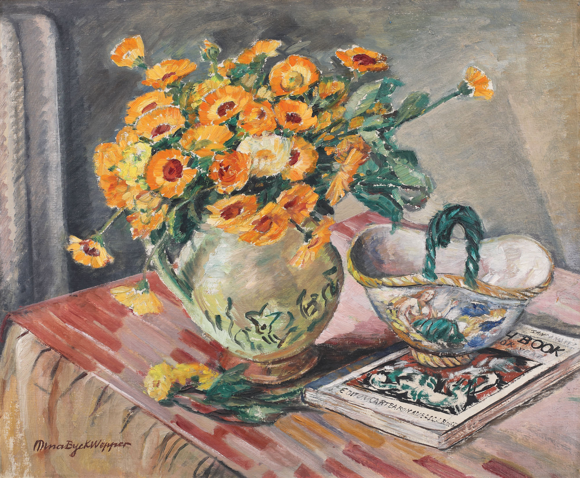 193. Natură statică cu vas cu gălbenele și bombonieră