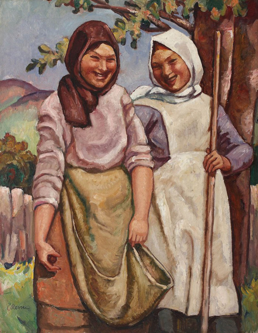 Camil Ressu a fost unul dintre cei preocupaţi de realizarea unei arte care să reflecte realitatea românească, specific naţională. Repingând poporanismul și motivele facile, a căutat în arta populară originea unui stil autentic, care trebuia să reflecte spiritul românului. Respingând formele de împrumut care pătrunseseră în arta acelei perioade, odată cu plecările artiștilor la studii în străinătate, a fost preocupat de găsirea izvoarelor legitime pentru stilul specific românesc ce se cerea aflat, pentru a se afla în centrul unei școli naționale de pictură. Astfel marile compoziţii pictate ale lui Ressu au ca subiect, aproape invariabil, omul simplu, ţăranul, viaţa de la ţară, muncitorul sau ritualul muncii. Lumea satului a început să fie un subiect predilect în creaţia artistului mai ales după anul 1920, perioadă când se afirma o tendinţă a gustului pentru monumental, decorativ şi accentuarea valorii simbolice. Subiectul de față, al cuplului de țărănci (una cu greblă și alta cu fota ridicată) apare mai târziu în creația lui Ressu, în prima jumătate a anilor '40, însă individual, personajele se regăsesc compuse încă din perioada în care pictorul realiza "Odihna la câmp", așadar mijlocul anilor 1920.