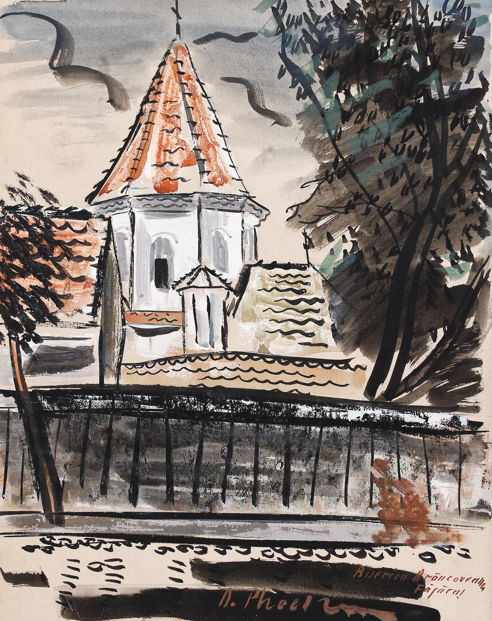 semnat, intitulat și localizat dreapta jos, cu brun "A. Phoebus, Biserica Brâncoveanu, Făgăraș"