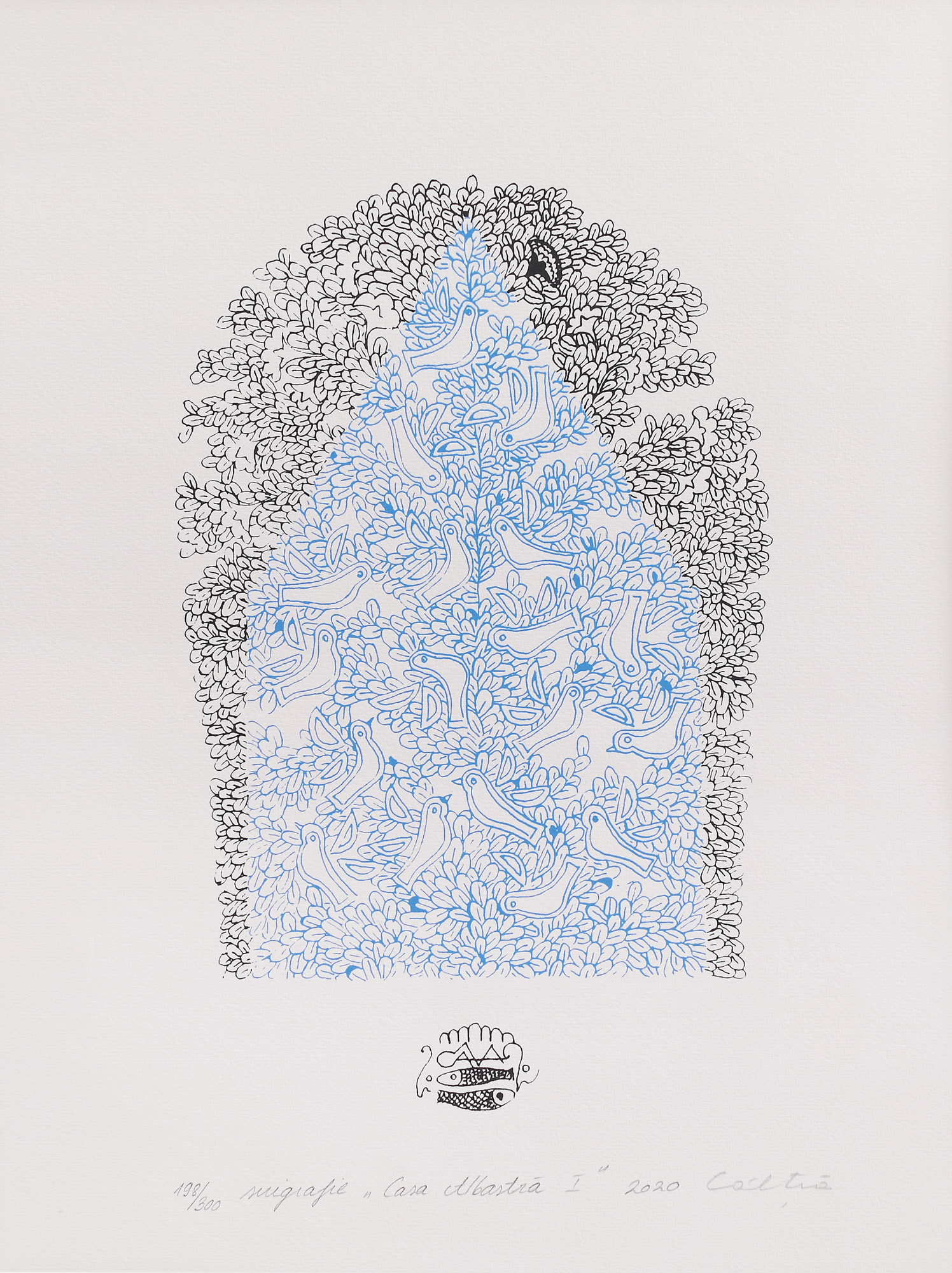 semnat, datat, intitulat, numerotat și notat central jos, în creion, "Câlția, 2020, Casa albastră I, 198/ 300, serigrafie"