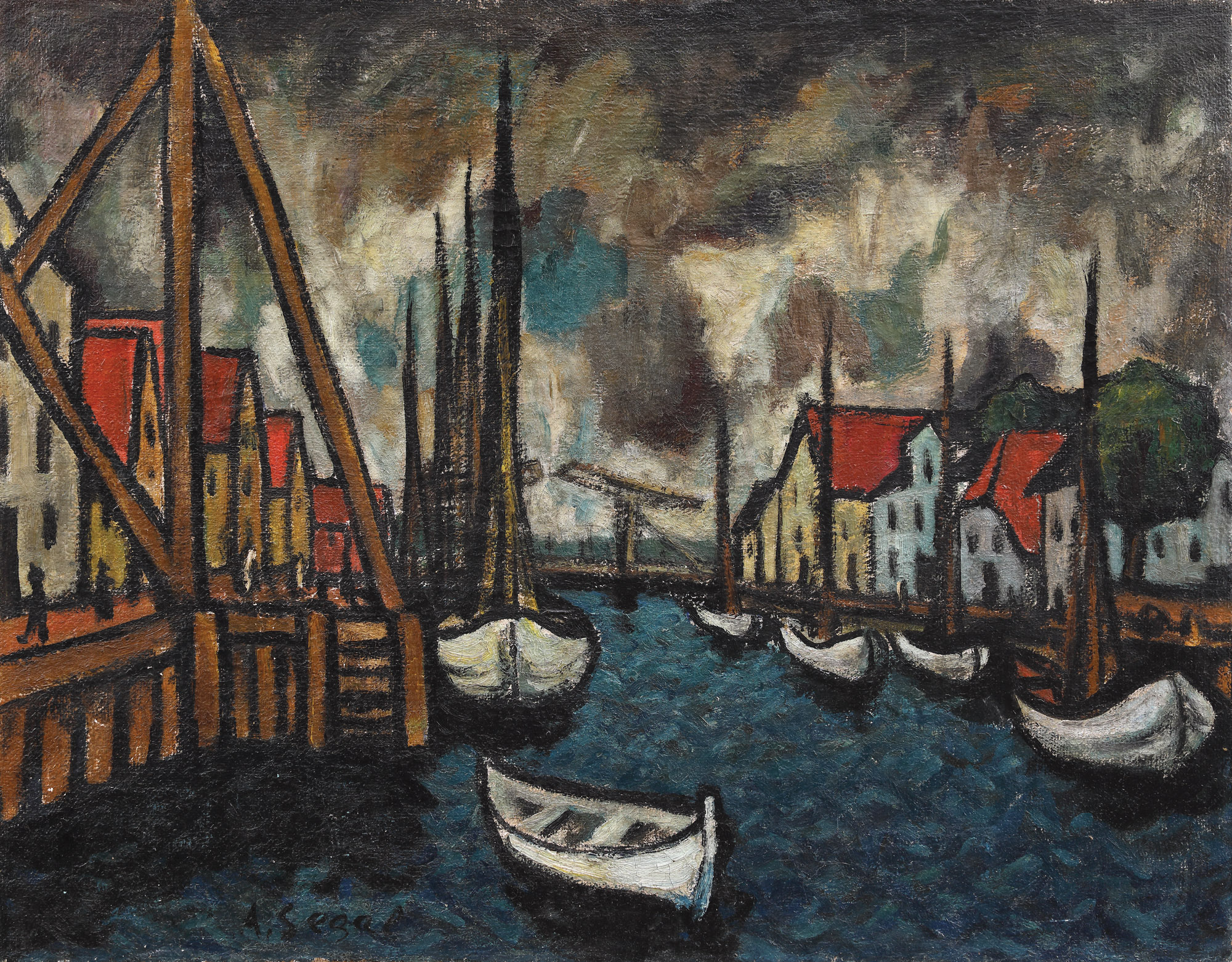 Arthur Segal este fără îndoială unul dintre înaintașii picturii moderne europene, fiind contemporan și participant activ în marile schimbări artistice ale începutului de secol XX. Lumea artistică berlineză avea să devină pentru Segal principalul motor de inovație încă de la sfârșitul secolului al XIX-lea. În 1892 tânărul pictor incepea să urmeze cursurile Academiei de Artă din Berlin, la clasa lui Eugen Bracht, pentru ca, în următorii ani, să se specializeze atât în Paris, cât și în Munchen. În cel ce avea să devină fondator al unor mișcări de orientare avangardistă și unul dintre motoarele dezvoltării avangardei românești din anii ’20, întâlnim, la începutul carierei, un artist cantonat în experimente postimpresioniste și neoimpresioniste. Exemplul cel mai puternic în conturarea stilului specific lui Segal în prima etapă de creație îl constituie apropierea de opera pictorului elvețian Giovanni Segantini, cu care intra în contact din anul 1896, an în care începe studiul la Academia de Arta din München. La nivel tehnic, preia de la acesta maniera pointilistă, transpusă într-un stil mai temperat, spre deosebire de marele ei teoretician, Georges Seurat. Aceasta persistă în compozițiile lui Segal în perioada 1902 – 1914. Apropierea de expresioniștii germani, în special după reîntoarcerea în Berlin (1904), avea să îl introducă atât în sânul grupării Der Sturm, cât mai ales în rândul celor care organizau Noua Secesiune (Die Neue Secession) - Pechstein, Ernst Ludwig Kirchner sau Tappert - devenind el însuși membru fondator. Adept al fovismului, pictând în tehnică pointilistă, folosind elemente ale expresionismului (atât în ulei cât și în gravură), Segal era la 1911 (anul pictării tabloului de față) un membru ilustru al modernismului german. Subiectul de față se regăsește în planșa de imagini tipice pentru neoimpreioniști, subiectul marin (al portului) fiind des întâlnit la Seurat sau Signac sau Van Gogh.
