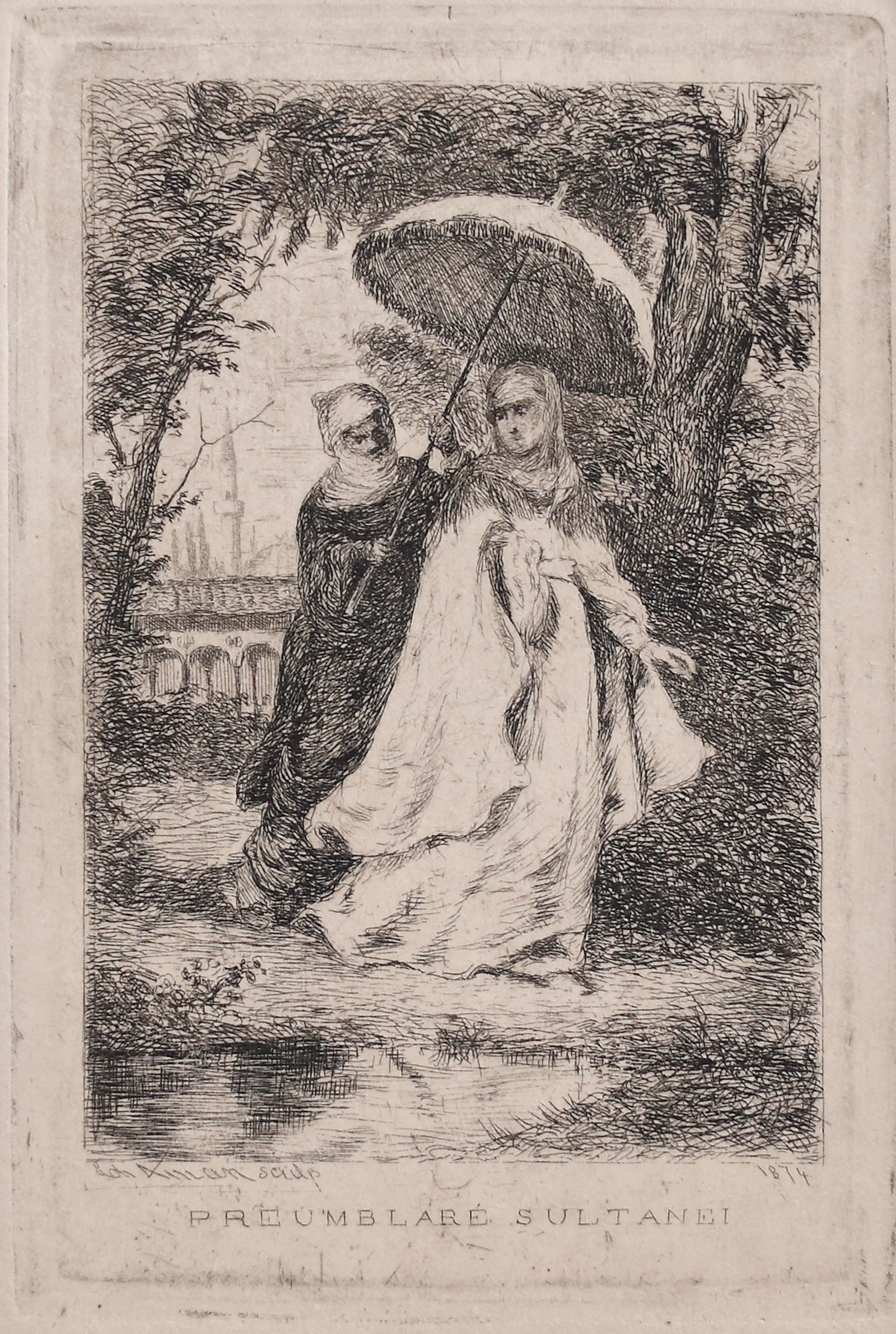 semnat, gravat, stânga jos, sub cadru, "Th. Aman sculp"; datat, gravat, dreapta jos, sub cadru, "1874"; intitulat, gravat, central, sub cadru, "PREUMBLARE SULTANEI"