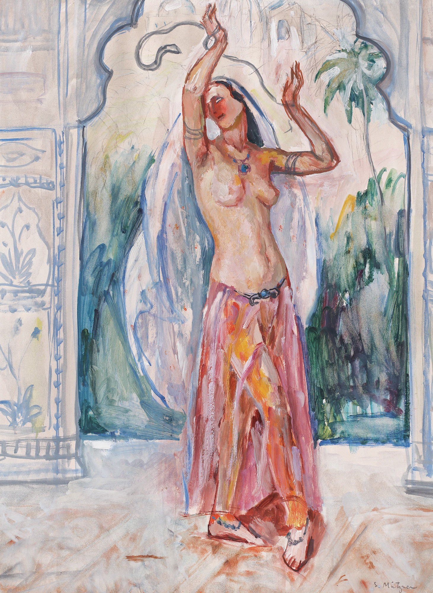 Unul dintre cei mai însemnaţi exploratori ai culturilor din afara graniţelor ţării, Samys Mützner (pe numele său evreiesc) a experimentat aceste călătorii pe meleaguri străine, mai ales în perioada 1912-1919, ajungând rând pe rând în Africa de Nord, Japonia, China, Coreea, Filipine, India, apoi Venezuela, Spania, Tunisia etc. Vorbim aici despre cea de-a doua perioadă artistică a lui Mützner, în care descoperă importante resurse stilistice: acum dispar contrastele puternice, lumina devine din ce în ce mai blândă, iar nuanţele de roz şi verde pal, tonalități de albastru, galben şi argintiu sunt aşternute pe suprafaţa tabloului cu o manieră uşor indepărtată de tehnica pontillage-ului. Din categoria acuarelelor acestei perioade fac parte şi cele trei lucrări ale artistului, în care este reprezentat unul dintre cele mai atrăgătoare subiecte ale mediului oriental, obiectul creaţiilor scriitorilor şi artiştilor europeni, deopotrivă: dansatoarele orientale. În tradiţia egipteană, dansatoarele puteau fi simplele “ghaziyyah”, acele dansatoare populare care se manifestau în locurile publice – pe străzi, în pieţe, ori cafenele – deseori în compania muzicienilor ambulanţi, pentru a putea antrena spectacolul improvizat. Însă adevăratele dansatoare erau instruite şi numite “almeh” sau “almah” (sapiente). Dansatoare culte, sofisticate, care aparţineau unei clase sociale elevate, aveau acces liber la harem, iar prezenţa lor era foarte dorită în rangurile sociale înalte. Din această categorie face parte şi dansatoarea lucrărilor noastre. Prezenţă rafinată, femeia este învăluită sumar de o amplă fustă, a cărei transparenţă lasă să se întrevadă picioarele încrucişate în mişcări lascive. La fel de amplu este şi voalul ce-i acoperă capul şi partea din spate a bustului dezgolit. Elementul arhitectural al arcadei din spatele dansatoarei, ne determină să credem că acţiunea se desfăşoară în interiorul unei clădiri, al unui palat oriental, cu specificele motive decorative arăbeşti. Asemenea picturilor din perioda renascentistă, dar cu o perspectivă schițată, arcada lasă să se întrevadă la orizont oraşul-cetate, înconjurat de vegetaţia specifică locurilor orientale. Mult mai atrăgătoare prin simbolistica lor sunt însă mişcările dansatoarei orientale. Picioarele, în permanent contact cu pământul, constituie de fapt acea poziţie care în antichitate exprima forţa şi stabilitatea femeii. Mâinile acesteia pun în valoare expresia corpului, prin mişcări care simbolizează actul de a se oferi pe sine. Cu delicatele unduiri ale bazinului, care amintesc de undele mării, element natural legat de sfera femininului, sau cu mişcări ce amintesc de sfera animalieră, cum este cămila sau şarpele, emblema energiei vitale, dansatoarea asumă senzualitate, energie şi o expresivitate unică.