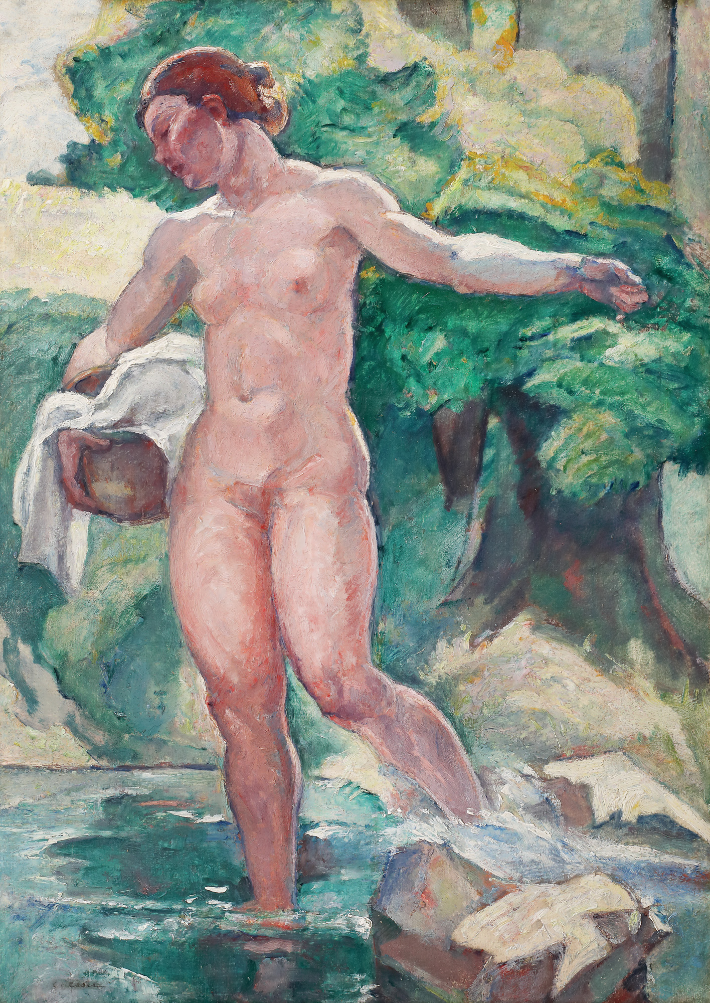 Temă fundamentală a artei clasice din toate timpurile, nudul sau tratarea figurii umane a constituit unul dintre programele artistice predilecte ale lui Ressu (mai ales după 1920), temă de altfel recurentă şi în cazul multor contemporani de-ai săi (Matisse, Picasso, Rodin și mulți alții). După sculptura greacă şi arta lui Michelangelo, odată cu Ressu, în arta românească se poate vorbi despre nud ca un mijloc direct de expresie, adoptat din profunde motivaţii de ordine interioară, reprezentând totodată şi genul ce se pretează cel mai mult mijloacelor grafice şi expresivităţii liniei, precum şi o modalitate de expresie a idealului artistului de frumuseţe feminină. Înrudit prin viziune cu robusteţea formelor umane specifice lui Michelangelo şi a Renaşterii în general, precum şi cu voluptuoasa carnalitate rubensiană, Ressu aplică nudurilor sale o frumuseţe mai aproape de natură, aproape eroică. Femeile lui Ressu sunt aşadar lipsite de graţie, aşa cum era aceasta concepută în mitologia romană; farmecul acestora îşi găseşte expresia deplină în conştiinţa fiecărui personaj, a senzualităţii sale naturale şi primordiale, contrastând astfel o mai veche viziune a idealului de frumuseţe nobilă. Ambientat în mijlocul naturii, într-un peisaj cu arbori seculari şi apa limpede şi domoală a unui râu, nudul operei „La pârâu” se apropie din punct de vedere compoziţional de lucrările „Zi de vară” (nedatat – ca. 1919, MNAR), „Valul” (nedatat – ca. 1912, Muzeul Brukenthal, Sibiu), şi „Peisaj. La scăldat” (nedatat – ca. 1924-1926, Colecția Ioana şi Alexandru Beldiman). Cu aceeaşi permanentă aplecare către clasic, prezentul nud manifestă preocuparea artistului pentru depăşirea atitudinilor statice, înfăţişând un corp uşor torsionat pe axa sa, cu braţul şi gamba stangă suspendate în timpul unei mişcări energice, oferindu-i astfel posibilitatea de a pune în valoare tensiunea muşchilor, plenitudinea încheieturilor şi unduirea coapselor.