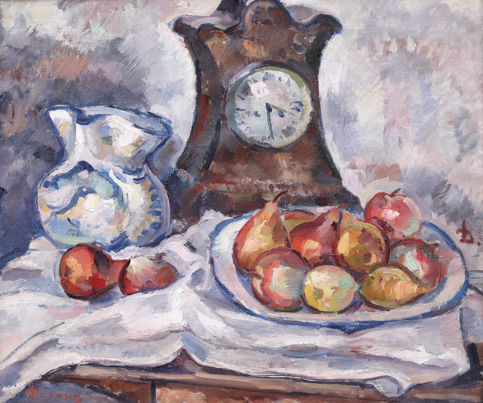 semnat stânga jos, cu roșu, "Dărăscu"; semnat lateral dreapta, cu brun, "D."