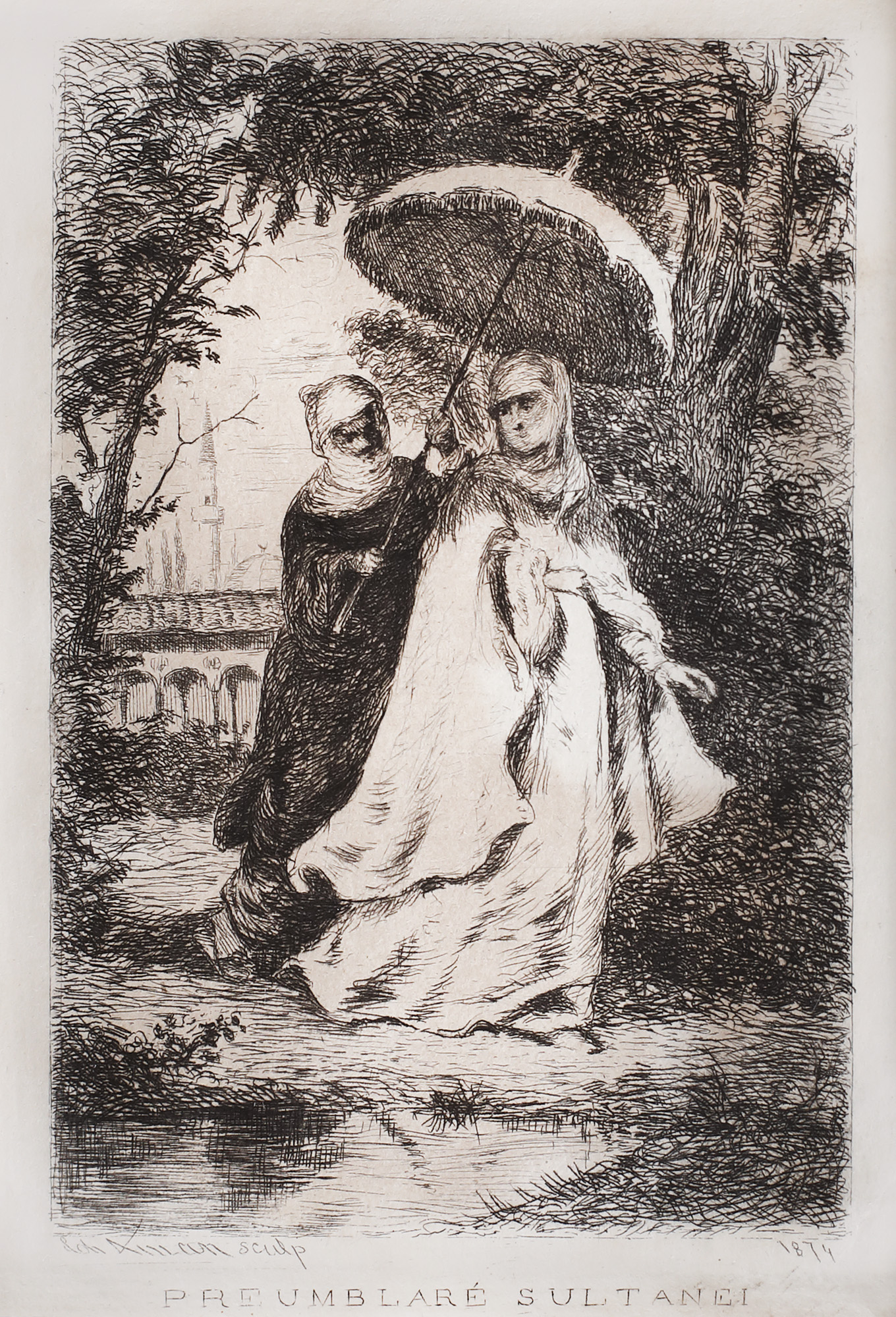 semnat stânga jos, sub cadru, în placă, "Th. Aman sculp"; datat dreapta jos, sub cadru, în placă, "1874"; intitulat central, sub cadru, "PREUMBLARE SULTANEI"
