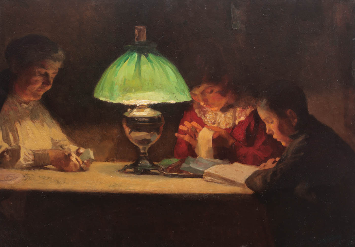 Cariera lui Ipolit Strâmbu ne oferă imaginea unui artist care și-a găsit lesne un loc important în istoria artelor românești. Școlit inițial în cadrul Școlii de Belle Arte, avându-l drept prim maestru pe G.D.Mirea, pictorul își va desăvârși maniera atât în anii petrecuți la München (1896 - 1901), cât și prin apropierea de numele reprezentative ale generației sale (Vermont, Verona sau Loghi), fapt materializat în acel stil post-grigorescian, vizibil și în cazul celor enumerați. Membru important al Tinerimii Artistice, profesor la Belle Arte pentru mai bine de 30 de ani, Strâmbu nu va neglija componenta estetică a creației sale care se va mula într-o măsură importantă după gustul publicului, în special al micii burghezimi bucureștene. După 1907, când renunță voit la subiectele grigoresciene – scene ludice cu țărani – pictorul se va orienta\ spre motive mult mai relevante epocii. Apar astfel scene intimiste, momente din viața orașului, axate în special în jurul personajului feminin. Scenele cotidiene coordonează universul pictural conceput în ultimele două-trei decenii de practică artistică, schimbarea de subiect fiind evidentă imediat după momentul 1907 – “Femei curățând caise” (cca. 1908, M.N.A.R., inv. 69985). Predilecția pentru suprafețe generoase i a oferit oportunitatea conceperii unor compoziții cu mai multe personaje, grăitoare fiind scenele de interior sau din grădini. Opera de față – “Seara în familie” – își găsește imediat locul în acest ciclu pictat de Strâmbu până către finalul vieții și răspunde acelorași precepte stilistice ca și în trecut: efectul de ecleraj, căruia i-a fost tributar constant, atmosfera intimistă sau folosirea unor modele feminine. (I.P.)