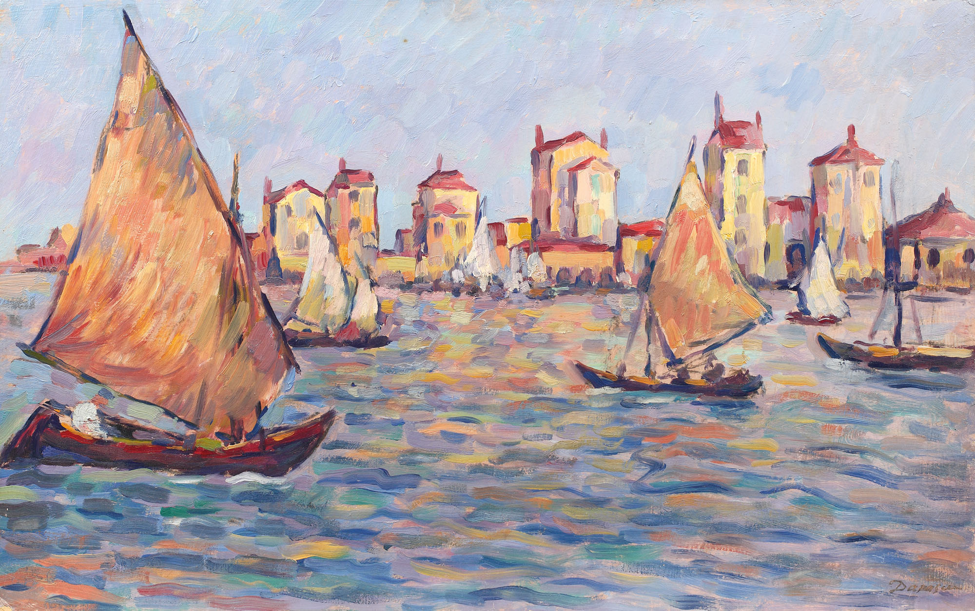 Cariera de maturitate a lui Nicolae Dărăscu poate fi identificată într-o bună măsură după prezența în corpul pictural a Venețiilor. Atras de impresionism încă din perioada cursurilor la Școala de Belle Arte din București, primul sejur de studii în Paris îi va oferi revelația impresionismului și a pointilismului, manieră pe care o va practica câțiva ani, sub influența creației lui Signac. Prima călătorie pe care o întreprinde Dărăscu în nordul Italiei, la Veneția și Chioggia, se consuma în jurul lui 1910, aceeași perioadă în care Gheorghe Petrașcu descoperea și el vedutele lagunare. Primul ciclu cu adevărat coerent ce a surprins laguna italiană s-a conturat între anii 1914-1915, perioadă în care Dărăscu începea să depășească etapa pointilistă prin aprofundarea paletei cromatice, și mai ales prin utilizarea din ce în ce mai pregnantă a uleiului, ce căpăta din nou importanță în fața acuarelei atât de îndrăgite. Pensulație cu pensulație, Dărăscu descoperea concomitent materialitatea pastei dar și valoarea picturală a culorilor, pe care începea să le folosească din ce în ce mai abundent, sub plin imperiu plein-airist. Peisajul îşi pierde din calităţile de pur motiv pictural, deoarece acesta resimte o mutaţie în valorificare, metodele cromatice fiind astfel încărcate de importanţă. Astfel locurile alese de pictor au doar menirea de a oferi primul strat vizual şi desigur că trebuie să ofere și elementele propice unei reproduceri, efectul de lumină sau o perspectivă generoasă şi atrăgătoare. Aici vedem cum în tuşe generoase de galben şi roşu, în conexiuni de oranj, Dărăscu modelează atât clădirile din plan secund, dar şi micile vase pescăreşti pe care le are în imediata proximitate. Dărăscu modelează suprafeţele picturale prin succederea multiplă de mici volume cromatice individualizate, fapt relevat de consistenţa materială pe care o primesc toate zonele de interes. În pictarea cerului se observă cel mai lesne acest lucru, mici pete de culoare fiind coordonate de o pensulaţie în tuşe multiple.