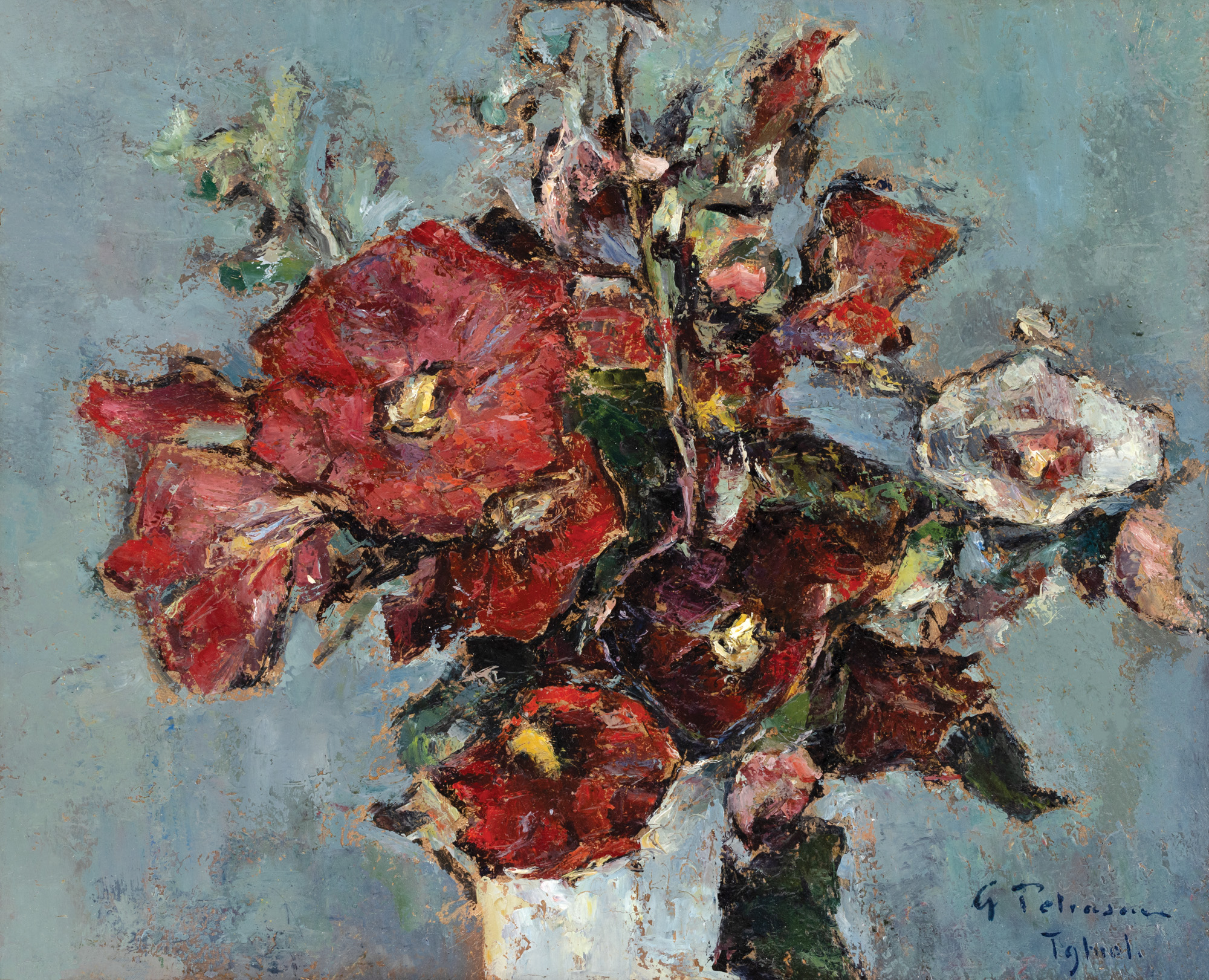 Florile au pătruns în creația lui Gheorghe Pătrașcu încă de la începuturi, Fie că sunt garoafe, lalele sau nalbe, micile fragmente de natură capătă adesea planul central al pânzei și devin o incontestabilă lecție de virtuozitate plastică pe care artistul a insistat de atâtea ori să o reia. Realismul debordant din operele sale e îndeaproape legat de studiile în domeniul științelor naturale pe care le-a realizat artistul. Influența marilor maeștri universali asupra operei lui Petrașcu e consemnată de critica vremii într-un articol dedicat expoziției retrsopective ”G. Petrașcu” din 1972. Pasta suculentă și strălucitoare ni-l dezvăluie pe Monticelli, iar structurile realizate în cheie cubistă ni-l indică pe Cezanne. Admirabil în postura desenatorului, ca și Luchian, Petrașcu lucrează direct din culoare, atribuind materiei picturale o consistență particulară, marcă a stilului său personal. Artistul va stărui asupra universului familiar și-l va include adesea în pânzele sale. Penelul său a urmat în repetate rânduri conturul mărului, al vasului de gătit sau al cărții. În naturile sale statice, Petrașcu devine un maestru al clarobscurului prin redescoperirea luminii încorporată în materie. Forța de execuție a pictorului ni se relevă în culoarea atinsă de vârful cuțitului, în coloritul vibrant al petalelor și în strălucirea vasului care conține florile. Aspectul fluid al formelor reprezentate e încununat frecvent de utilizarea negrului. Artistul a conferit o expresivitate extraordinară acestei nuanțe, pe care a adaptat-o aproape scenografic, în încercarea de a cuprinde în pânze atmosfera din atelierul său, decorat cu nunațe de negru, alb și accente roșiatice.
