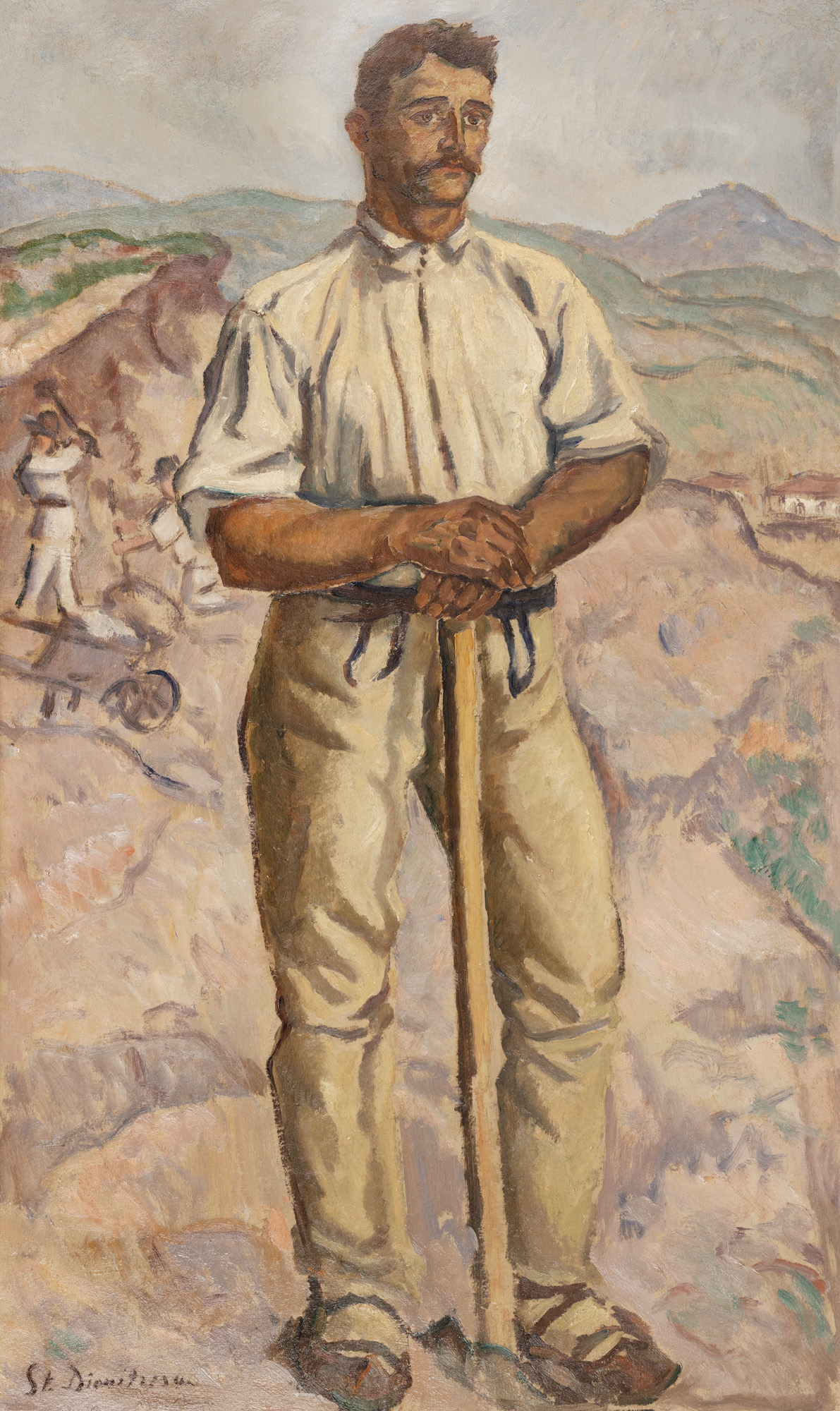 Opera lui Ștefan Dimitrescu se împarte între portrete, peisaje sau scene de gen. Artistul surprinde adesea lumea satului sau culoarea locală a Dobrogei, portrete de turci, țărani sau muncitori. În portrete mizează mai degrabă pe descifrarea complexității tumultului interior al protagoniștilor săi, conferindu-le expresii neutre sau, uneori, meditative. Portretul îi permite, de asemenea, să se impună și în postura desenatorului. Personajele schițate se împletesc armonios cu deciziile cromatice ale artistului. Veleitățile sale din sfera muzicală sunt transcrise în ritmuri cromatice armonioase, cu accente puternice, în contraste evidente. Prin culoare, Dimitrescu subliniază atât umbra și lumina, cât și forma și modelajul. Acordă, de asemenea, o atenție deosebită vestimentației personajelor sale și accesoriilor pe care le primesc acestea. Preocuparea pentru tematica socială și interesul incontestabil pentru psihologia umană sunt remarcate atât în scenele de gen sau portrete, cât și în peisaj. Opera de față se remarcă atât prin compoziția captivantă, cât și prin dimensiunile impresionante asupra cărora și-a desfășurat pictorul actul creator. Prezență robustă, impunătoare, cu caracteristici bine definite, protagonistul reprezentat în costum tradițional se regăsește în centrul lucrării, sprijinit în toiag, lăsând totuși suficient spațiu în jurul său pentru desfășurarea peisajului. Formațiunile de relief și culorile terne deschid cadrul ideal pentru conturarea scenei de muncă; cele câteva personaje din planul secund contribuie, de asemenea, la ilustrarea subiectului.