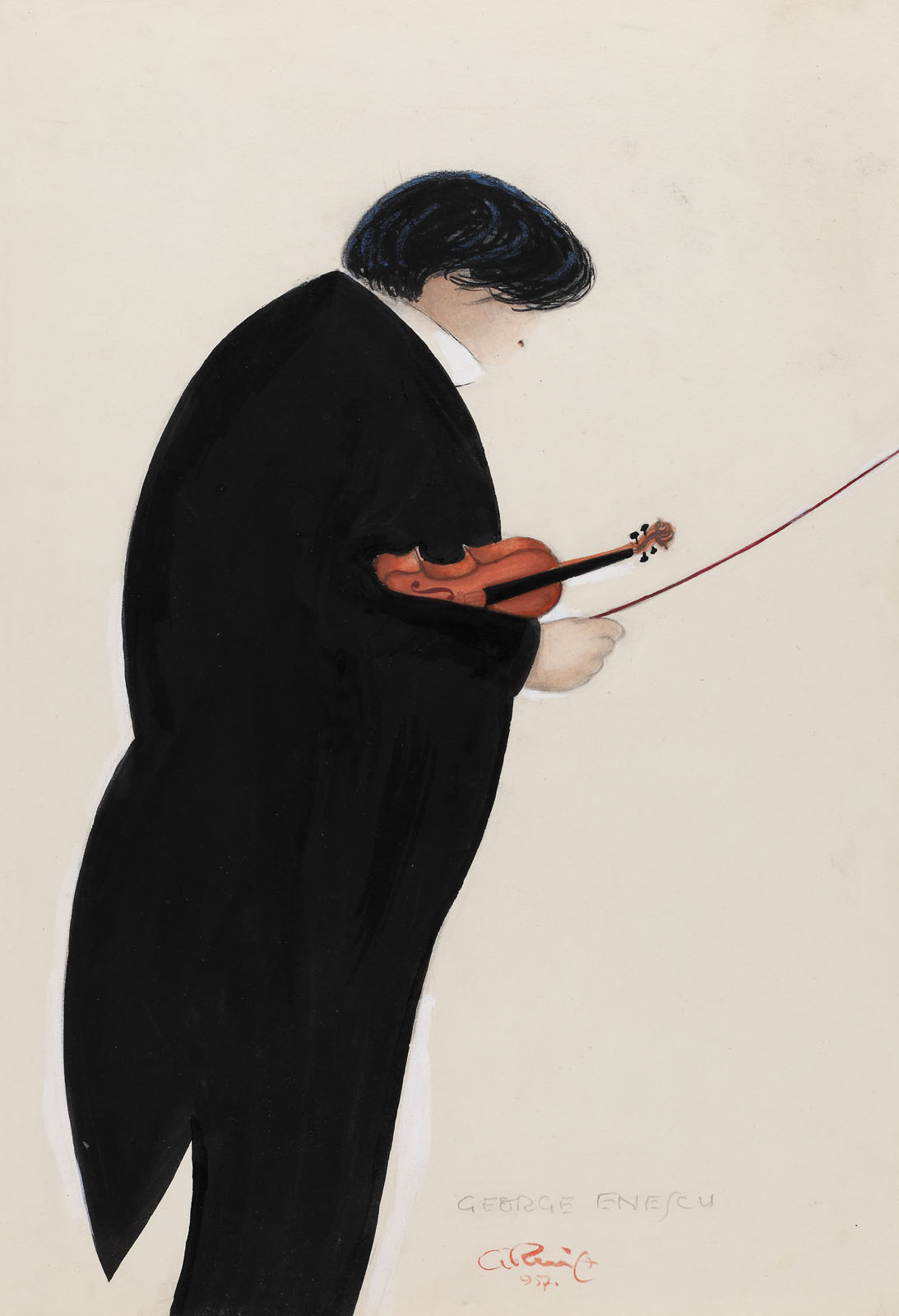 semnat și datat central jos, cu roșu, "GruiA, (1)957"; intitulat central jos, în creion, "GEORGE ENESCU"
