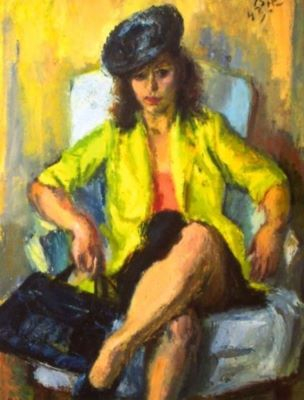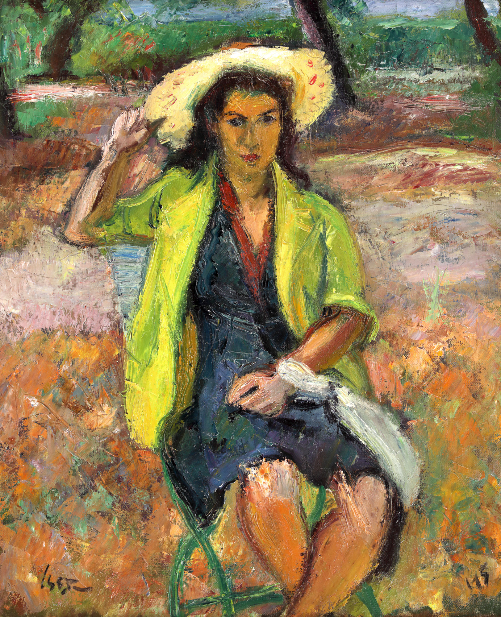 Deși debutează în artă cu o viziune caricaturală asupra lumii, Iosif Iser își dezvoltă treptat un simț aprofundat față de ființa umană, cu precădere asupra modelului feminin. Își categorisește opera în cicluri dedicate odaliscelor, spaniolelor, colombinelor, balerinelor ori studiilor de nud asupra trupului muzelor sale. Însă vom regăsi, aievea, pe lângă rezultatele peregrinărilor pe care le întreprinde, și câteva creații care aduc în prim-plan femeia obișnuită de la oraș sau pe cea de la țară. Linia sintetică, prin care pictorul rezumă forme și volume și cu ajutorul căreia transcrie întreaga paletă cromatică ne-o dezvăluie, de această dată, pe protagonista lui Iser așezată pe un scaun, pozând pentru artist înconjurată de natură. Putem vorbi, și în acest caz, despre transpunerea caracteristicilor specifice unei întregi tipologii. Dacă în cazul odaliscelor ne confruntam cu ipostazele statuare care vădeau senzualitate și costumația specifică formată din șalvari și văluri transparente; în opera de față observăm faptul că artistul a optat pentru articole vestimentare specifice femeii din Occident, la mijlocul veacului XX. Rochia lungă, până la genunchi, ilustrată într-o cromatică întunecată, sacoul în culori contrastante, pălăria cu bor lat și părul aranjat conform modei vremii ne reamintesc de existența cotidiană a pictorului vrăjit de atâtea ori de culorile orientului. Vom vedea că, deși peregrinările sale au fost de mult încheiate, motivele sunt reluate în repetate rânduri, iar anumite elemente sunt transferate și altor lucrări. Îndeosebi nuanțele răsăritene vor izvorî și în lucrări precum aceasta, ivindu-se sub tertipuri precum culoarea anotimpului sau transformarea naturii. Motivate astfel, alegerile lui Iser ne transpar drept idealizări ale reveriilor sale și un pretext pentru a studia, încă o dată, modelul feminin.