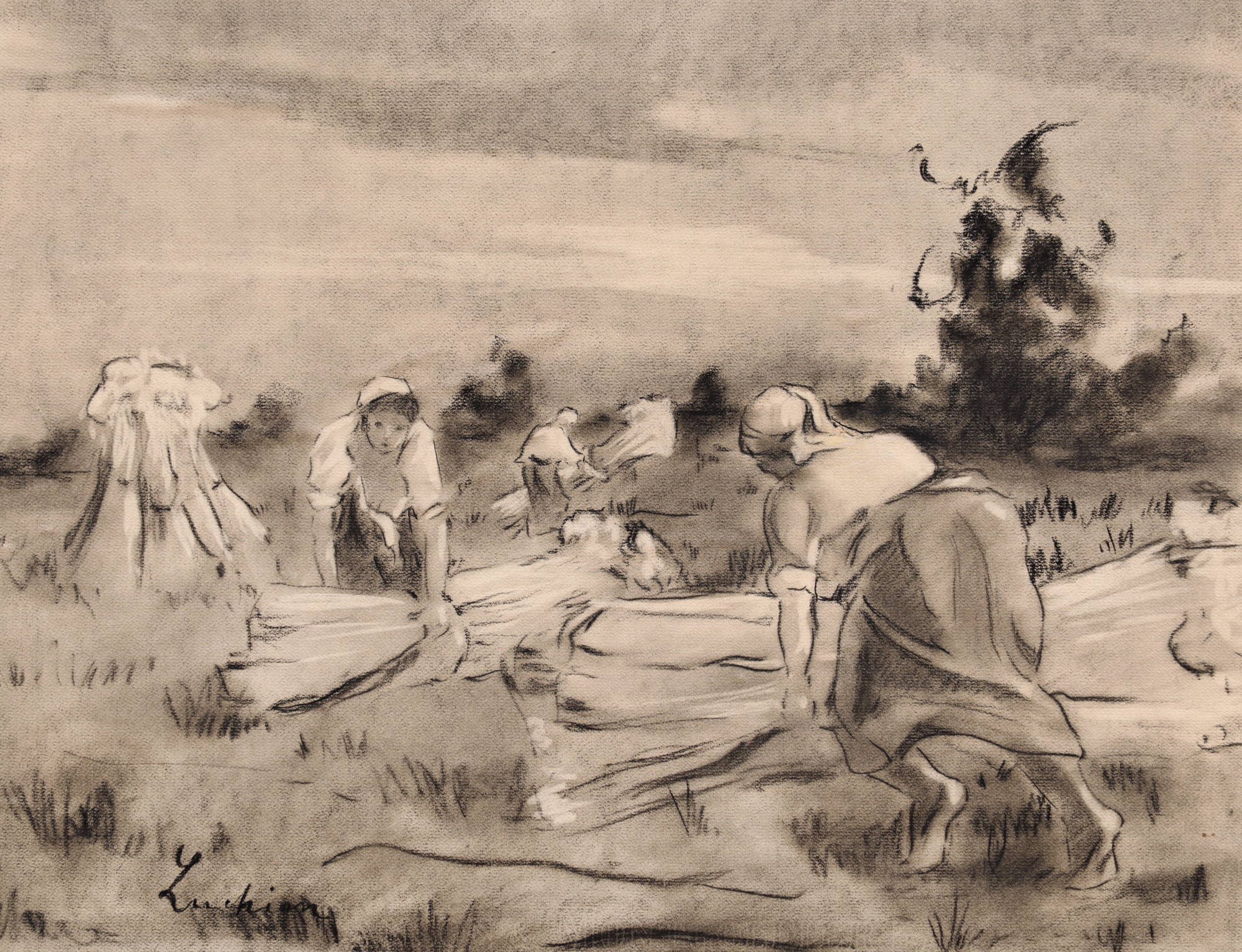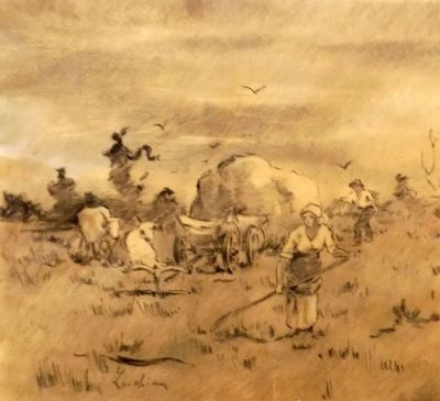 Alături de cei doi frați mai mici și de copiii din vecini, Ștefan Luchian se va găsi adesea jucându-se pe străzile învecinate casei sale și va porni, deseori, în așa-zise expediții către Podul Vergului, Obor sau mahalaua Negustorilor. Duminica se aventura pe drumul bisericii, acolo unde i se îngăduia, uneori, să tragă clopotul cel mare. Deși este fiul unui fost maior-comandor al garnizoanei din Ștefănești, Luchian nu va urma cursurile Școlii de Infanterie, ci va studia simultan Belle Artele și Conservatorul. Cursurile urmate sub îndrumarea lui Theodor Aman sau Gheorghe Tattarescu îi oferă cadrul necesar pentru deprinderea cunoștințelor prodigioase în arta desenului, cunoștințe pe care le va aplica cu religiozitate în descrierea trăsăturilor personajelor sale. Va studia, așadar, perspectiva academistă a artei, aceeași perspectivă pe care o va întâlni și în peregrinările sale prin capitala Bavariei. La München va realiza copii după marii maeștri expuși în Pinacoteca Veche – amintim aici transcrierea lucrării lui Rembrandt, ”Sfânta familie”, ce va reprezenta un episod revelator în traiectoria sa, dar și copiile efectuate după Correggio. Va ajunge mai apoi la Paris, acolo unde va descoperi un nou orizont cultural, mult mai potrivit temperamentului său. Cu priceperea autodidactului, se va delecta cu studiul marilor artiști expuși în muzee și galerii. Anul 1891, an important în economia artei universale, îl va aduce pe artistul român față în față cu operele lui Seurat, Signac, Touluse-Lautrec, Manet ori Van Gogh. Reîntors în țară, își îndreaptă atenția către tematica de sorginte pitorească și expune lucrări dedicate subiectului. În istoria artei românești Luchian rămâne cunoscut drept pictor al florilor și maestru al portretului. Umanist convins, se va folosi de artă pentru a pătrunde mai ușor în psihologia personajelor sale. Însă muzicalitatea operei sale plastice se transpune mai cu seamă în fizionomiile și chipurile feminine. Surprinde, de cele mai multe ori, femei elegante, misterioase, pline de grație, care par să ”stea la pozat”, cu vădite influențe ale impresionismului francez. Dar va schița și trupurile femeilor de la sat, surprinse în timpul muncii câmpului. Luchian va rezuma observațiile pe care le întreprinde asupra naturii într-un ciclu grafic care are în centrul său figura umană și cadrul natural în care oamenii își desfășoară activitatea. Oițe păscând, care cu boi pe drumuri de țară, personaje feminine surprinse în timpul strângerii fânului ori la cosit vor constitui temele de inspirație rurală care vor anima lucrările artistului odată cu revenirea în țară. Adoptă de această dată o paletă mai sobră și mizează pe redarea pronunțată a jocurilor de lumini și umbre. Tușele grave, apăsate, sunt transformate în opera de față în contururi ferme ale peisajului, ale personajelor ori ale păsărilor care plutesc în văzduh. Mult mai întunecată și mai lipsită de vitalitatea primordială pe care o regăsim în operele sale în ulei, lucrarea de față devine totuși reprezentativă și depășește granițele unei simple transcrieri în plein-air.