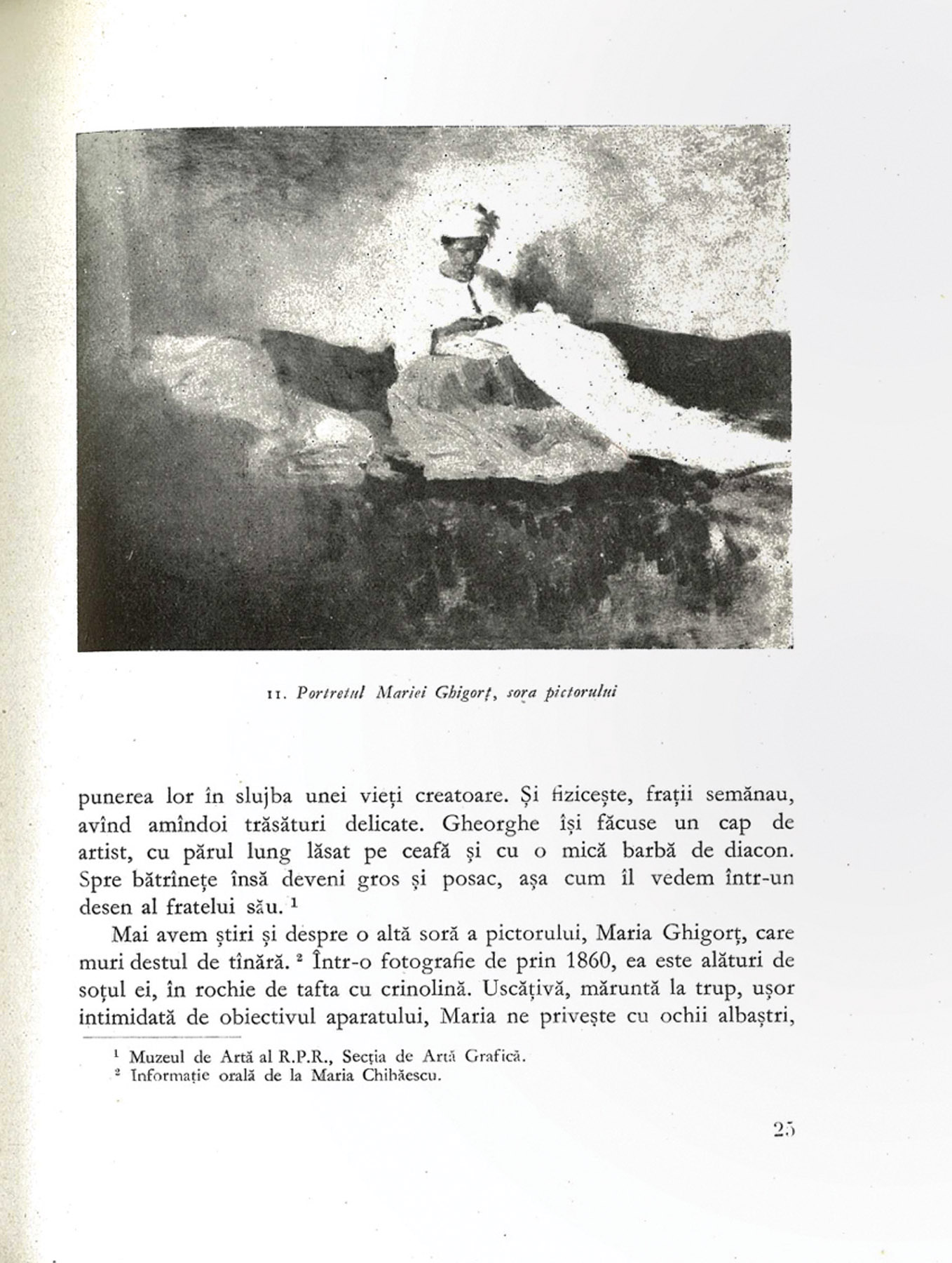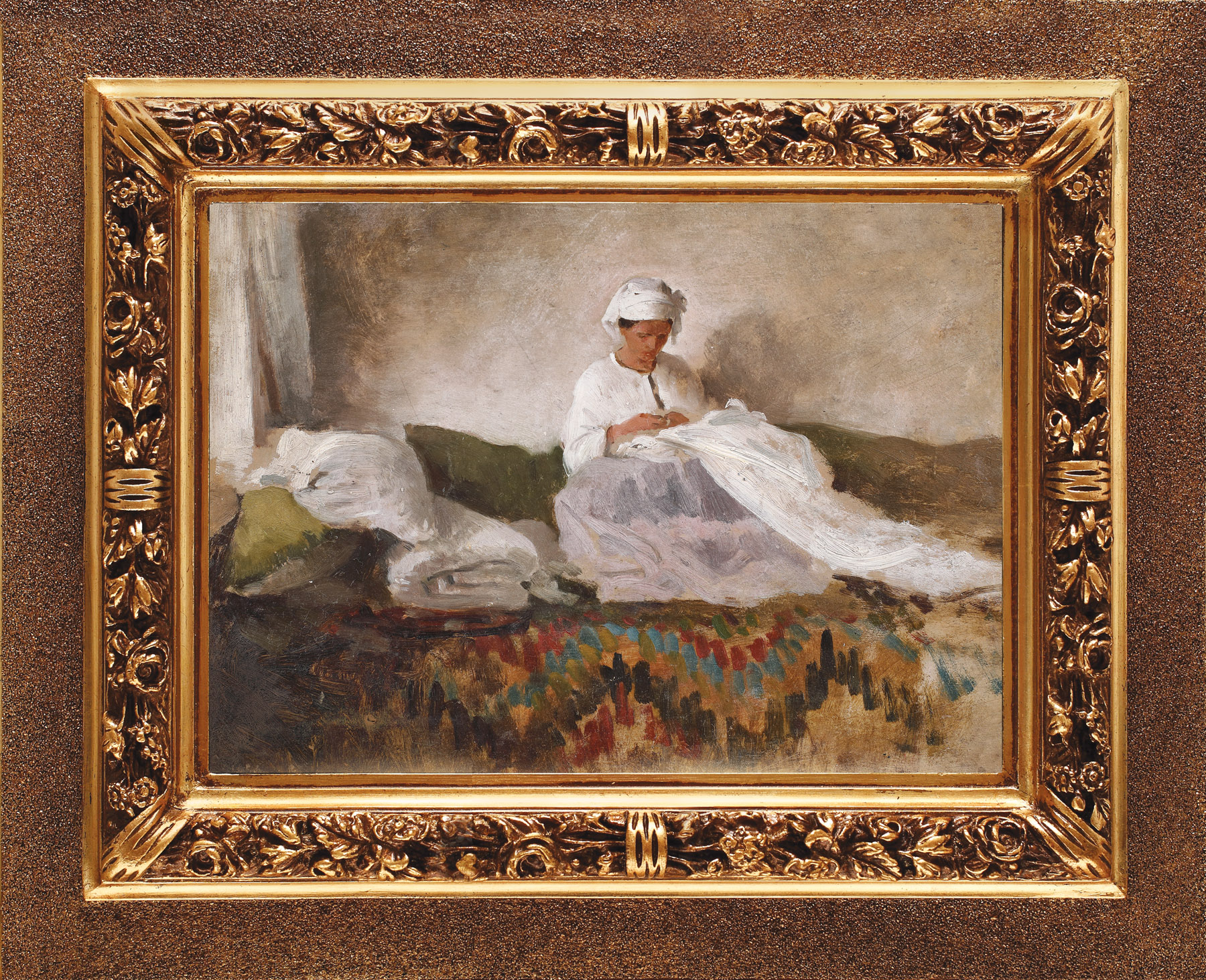 Publicată inițial de Alexandru Vlahuță în monografia Grigorescu din 1910 și numită Cosând (Au travail în ediția franceză din 1911), lucrarea reapare (beneficiind în titlu de identificarea modelului) în monografia Oprescu-Niculescu din 1961: Maria Ghigorț cosând. Este vorba despre Maria, primul născut al soților Ruxandra și Ion Grigorescu, dintre cei șase copii între care s-a aflat și viitorul pictor. Informația a fost probabil furnizată lui Remus Niculescu, de către fiul artistului, Gheorghe Grigorescu. Născută către 1830, Maria s-a căsătorit la vârsta de 13 ani, purtând de atunci numele soțului, Ghigorț. Se pare că a murit relativ tânără, ne informează aceeași monografie, unde este reprodusă și fotografia cuplului Ghigorț. Tânăra soție apare aici elegant îmbrăcată în rochie de tafta, cu crinolină, așa cum cerea moda franceză de la mijlocul secolului al XIX-lea. Scena de gen din lucrare o înfățisează așezată pe o sofa acoperită cu un covor muntenesc cu desene geometrice. Amplasat în centrul compoziției, personajul este reprezentat din față, ținând capul ușor aplecat peste lucrul de mână, o pânză albă, revărsată în valuri, spre dreapta. Sora artistului este îmbrăcată în alb, în ținută de interior, legată la cap cu tulpan așa cum purtau uneori țărăncile și boieroaicele rurale, un fel de a-și acoperi capul ce apare în portretele votive din bisericile țărănești ale Olteniei. Dealungul operei grigoresciene, numeroase scene de gen ce se succed (reprezentând femei cosând), sunt variații pe aceeași temă, constituind de fiecare dată, un alt studiu de lumină și câte o schiță de portret: de la Bretonă în vârstă cârpind ( c.1867, MNAR, inv.3322) și Maria Ghigorț (lucrarea de față), ce aparțin mai degrabă unei viziuni realiste, observației directe, la bretonele cosând din anii 1876 –c.1880 și ciclul de imagini melancolice ale Mariei Danciu (MNAR, inv. 82460/9332; etc), ce țin de un univers romantic în care lumina și întunericul se confruntă dramatic. În pictura de față, artistul pleacă de la motivul pe care realitatea îl oferă ochiului, o încăpere invadată de lumină diurnă (ce nu mai lasă loc zonelor de umbră) din care selectează imaginea sofalei cu Maria cosând, înconjurată de văluri de textile albe. Peste câmpul decorativ al covorului (geometrie și culoare) din partea de jos a lucrării, artistul ridică eșafodajul de alburi și griuri colorate ce constituie partea dominantă a compoziției cuprinzând și imaginea personajului. Albul lucrului de mână, reverberând lumină, o diagonală spre dreapta, devine protagonistul exuberant al imaginii. Grigorescu a executat și un desen datat 1870 cu același motiv, aflat în patrimoniul Cabinetului de Stampe al Bibliotecii Academiei Române. Remus Niculescu a expus în 1957 (cat.expoziție nr.307) un alt desen, Țărancă șezând, deasemenea datat 1870 și care o reprezintă probabil tot pe Maria Ghigorț cosând, cu mai multe detalii de individualitate fizionomico-anatomică (chipul, forma degetelor) decât în pictura noastră. Lucrarea pe care o comentăm aparține probabil anului 1870 când Maria avea în jur de 40 de ani. Pictura provine din importanta colecție de Grigorești a lui Ion și a Mariei Ionescu-Quintus din Ploiești, fiind achiziționată, se pare, din atelierul artistului. Numele Mariei Ionescu-Quintus apare ca proprietară a operei, în catalogul expoziției Centenarului artistului, organizată în 1938. (I.B.) Creator al tradiției românești și inspirat de însăși ființa poporului nostru, Grigorescu va deveni expresia artistului național. Inspirațiile sale permanente vor rămâne plaiul și oamenii satului românesc, pe care îi va regăsi mereu în locurile sale cele mai dragi. Ridicându-se el însuși dintr-un neam de țărani din regiunea de șes a Munteniei, pe nume Pitaru, județul Dâmbovița, pictorul Grigorescu se năștea într-o familie cu șase frați, care aveau să rămână de timpuriu doar în grija mamei, în urma pierderii tatălui. Pentru a-i putea îngriji, mama celor șapte copii se va îndeletnici cu croitoria, meșteșug pe care îl transmitea mai departe și fiicelor sale, dintre care cunoscute au rămas doar Elena (născută în jurul anului 1831 și căsătorită cu un anume Filionescu, funcționar la primărie) și Maria (după căsătorie, Ghigorț). Acest tablou avea să facă parte, în anii interbelici într-una din cele mai importante colecții,anume cea a lui Ion și a Mariei Ionescu-Quintus, ce strângea în visteriile sale opere semnate de Theodor Aman, Ion Andreescu, Nicolae Grigorescu, Ștefan Luchian, Nicolae Tonitza, Francisc Șirato, Marius Bunescu, Gheorghe Petrașcu, Iosif Iser, Sava Henția, Ștefan Popescu, Ion Theodorescu-Sion, Lascar Vorel, Aurel Jiquidi sau Constantin Jiquidi. Ion Ionescu-Quintus (1875-1933), se trăgea, pe linie maternă din familia Ivan Hagi Prodan. Tatăl său, Ghiță Ionescu, bancher, proprietar, fost primar al orașului Ploiești, avea cea mai luxoasă casă din Ploiești (azi Muzeul de Artă Ploiești). În perioada 1938-1940, în împrejurări nefericite, este pierdută una din valoroasele pânzele de Luchian, „Autoportret”, intitulat de artist „Un zugrav” și două pânze ce aparțineau lui Ion Andreescu, „Arătură la Barbizon” și „Dimineața la țară”. În aceeași perioadă, fiul mai mare al colecționarului, Mircea Ionescu-Quintus (1917-2017), cel care avea să intre în posesia colecției, desfășura tratative cu Pinacoteca municipiului Ploiești în vederea unei donații integrale a colecției, cu o clauză ce presupunea ca operele să fie distribuite în două săli, care să poarte în cinstea tatălui său, numele de Ion Ionescu-Quintus, demersuri care nu vor duce la un rezultat pozitiv. Ceva timp mai târziu însă, cu succes, o seamă de lucrări din colecția Ionescu-Quintus avea