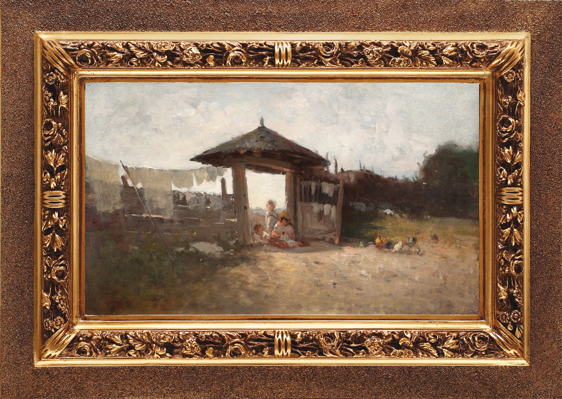 Scenele rurale în peisaj – ţăranii, aspectele de muncă, animalele în gospodăria de la ţară, apusurile de soare-apar în opera lui Nicolae Grigorescu în perioada de formaţie petrecută lângă Paris, la Barbizon şi Marlotte, în intervalul 1863-1869. Adoptarea tematicii specifice Şcolii de la Barbizon ca şi a tipului de viziune a acestei picturi de plein air, dar şi prezenţa bine marcată a artistului român în aceste locuri au determinat recunoaşterea lui Nicolae Grigorescu între membrii Şcolii de la Barbizon, de către istoricii artei franceze încă din timpul vieţii artistului şi apoi în continuare de către Henri Focillon (1928), Jean Bouret (anii 60) etc. Acelaşi tip de subiecte inspirate de realităţi din România încep să-şi facă loc în pictura lui Grigorescu către 1867 cu ocazia călătoriei în ţară, efectuată în acelaşi an. Ele vor câştiga treptat o pondere tot mai mare în ansamblul operei, dovedind voinţa artistului de a fonda o şcoală românească de pictură modernă, de a sugera conaţionalilor săi mai tineri, o linie tematică şi stilistică putând să exprime esenţele identităţi naţionale din perspectiva curentului realist. Motivul “ţărăncii la poartă” nu este atât de frecvent cât cel al altor scene rurale cunoscute. Se poate însă a aminti o capodoperă a maturităţii, "Fete lucrând la poartă" (ulei pe pânză, MNAR, inv.3320) pictată către 1888-1895, dar care nu se înrudeşte compoziţional cu tabloul nostru. Mai aproape pare a fi studiul "Poartă la ţară", reprodus în monografia Grigorescu de Vlahuţă (1910, p.250), desen în creion, aflat la acea dată în colecţia familiei artistului, la Câmpina. Nici aici însă nu este vorba de similitudini compoziţionale ci de analiza elementului de arhitectură populară în sine. Utilizarea culorilor din natură (brunurile roşietice, verdele, albastrul, griurile, alburile colorate) şi dozarea lor, repartiţia lor pe suprafaţa picturii ca şi soluţiile de organizare a regiei de ecleraj înscriu lucrarea de faţă la graniţa dintre anii formaţiei şi deceniul ‘70. Artistul este preocupat să redea - este subiectul pictural al tabloului - contrastul dintre zonele întunecate (în planul întâi, pământul şi vegetaţia) şi cele orbitoare de lumină - în centrul imaginii- provocate de o zi estivală. Sunt aici prezente într-o formulă încă nedecantată, în căutare de limpezire, mărci recognoscibile ale viziunii maestrului. Redarea calităţii luminii din peisajul românesc a fost mereu preocuparea sa. Semnalăm apoi fundalul informal al vegetaţiei (din stânga jos) ce aminteşte de viziunea şi tehnica lui Corot, artist reper pentru tânărul Grigorescu; ori modalitatea de a picta pământul în tuşe juxtapuse, scandate, în dreapta. Grafia semnăturii, diferenţiată de cea pe care o cunoaştem mai bine, măruntă şi calmă înspre final, susţine şi ea o asemenea încadrare cronologică. Putem ghici în prezentul tablou, încă de pe acum, capacitatea specifică a viitoarei opere mature de a sugera forma prin tuşe sintetice. Este ceea ce remarcăm la examinarea grupului de personaje din cadrul porţii, în fapt o "Maternitate" modernă, rurală, modelată din câteva trasături de penel, o replică personală putem spune, la princiarele madone renascentiste. Diferenţieri de tratare picturală se pot remarca între redarea spontană, de tipul “fa presto” a grupului de personaje şi fereastra de lumină exagerat de albă -ce pare adăugată ulterior- înscrisă în cadrul superior al porţii. Compararea celor două zone ne sugerează posibila realizare a imaginii în doi timpi: în aer liber mai întâi, în fata motivului şi un al doilea moment de lucru în atelier, constând poate în intervenţii întrerupte şi abandonate. (I.B.)