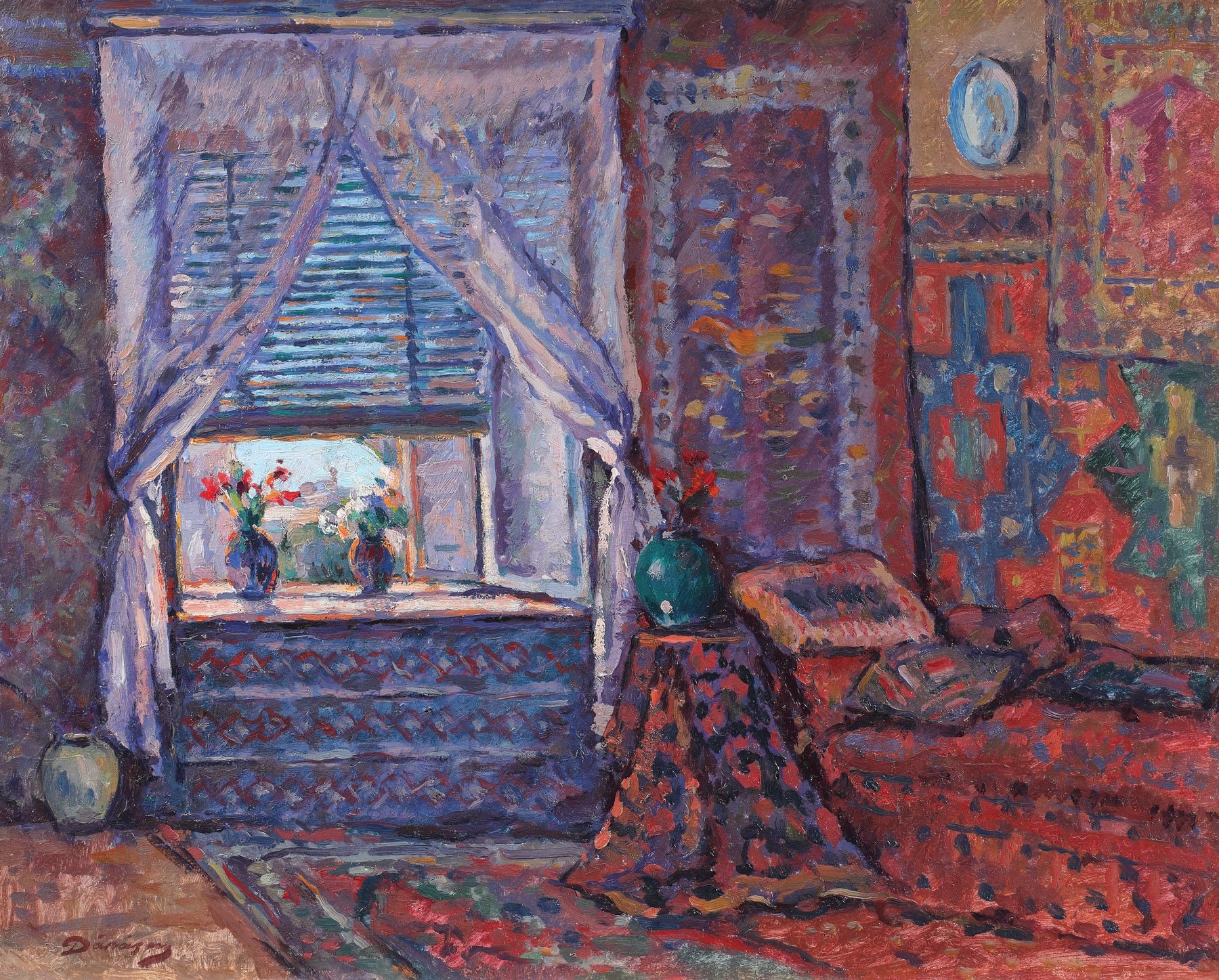 Format la Paris în spiritul picturii impresioniste, Dărăscu aducea cu sine o nouă pictură, purtătoare de noi orizonturi și noi preocupări de expresie și de limbaj, reliefându-se astfel ca un pictor care desenează prin culoare și care strecoară perspectiva, raccourciul, precum și forma printre culori. Oprindu-se la o gamă restrânsă, alcătuită de obicei din patru culori, pictorul nu va adopta sistemul opoziției culorilor calde și reci, culorile întrețesându-se în texturi dense, aproape uniforme, ale căror modulații valorice, împletite cu vibrațiile de tușe vor urmări logica formelor și a perspectivei, reușind asftel să ordoneze planurile și să redea structurile materiale în toată varietatea lor. Tușele spontane se subordonează desenului nevăzut, permanent implicat spațiului și formelor, precum și planurilor care se succed. Cu o amplă rezonanță, pictura sa preia vibrațiile lăuntrice ale artistului, pe care le sonează și pe care le face perceptibile. Astfel, jerbele de culori ce se strâng pe pânzele sale se întâlnesc pentru a smulge ceva din mirajul lumii, în fața căreia pictorul se află de fiecare dată cu o statornică sensibilitate. Concentrându-se mereu cu o meștejugită luare-aminte în fața motivului pe care se hotărăște să îl înveșmânteze, pictorul Dărăscu își tratează de cele mai multe ori subiectele în detaliu, precum este și cazul interioarelor de atelier. Destul de rar înfățișate, interioarele apar în repertoriul său prin preajma anilor 1914, an în care expunea la Ateneu alături de Ștefan Luchian, precum și la Tinerimea Artistică, realizând de asemeni și călătorii la Saint Tropez și Veneția, dar și mai târziu, în jurul anilor 1918-1919, perioadă în care îl întâlnim la Iași, unde era mobilizat din pricina războiului, în Dobrogea, precum și la București, unde își continua activitatea expozițională. (G.M.)