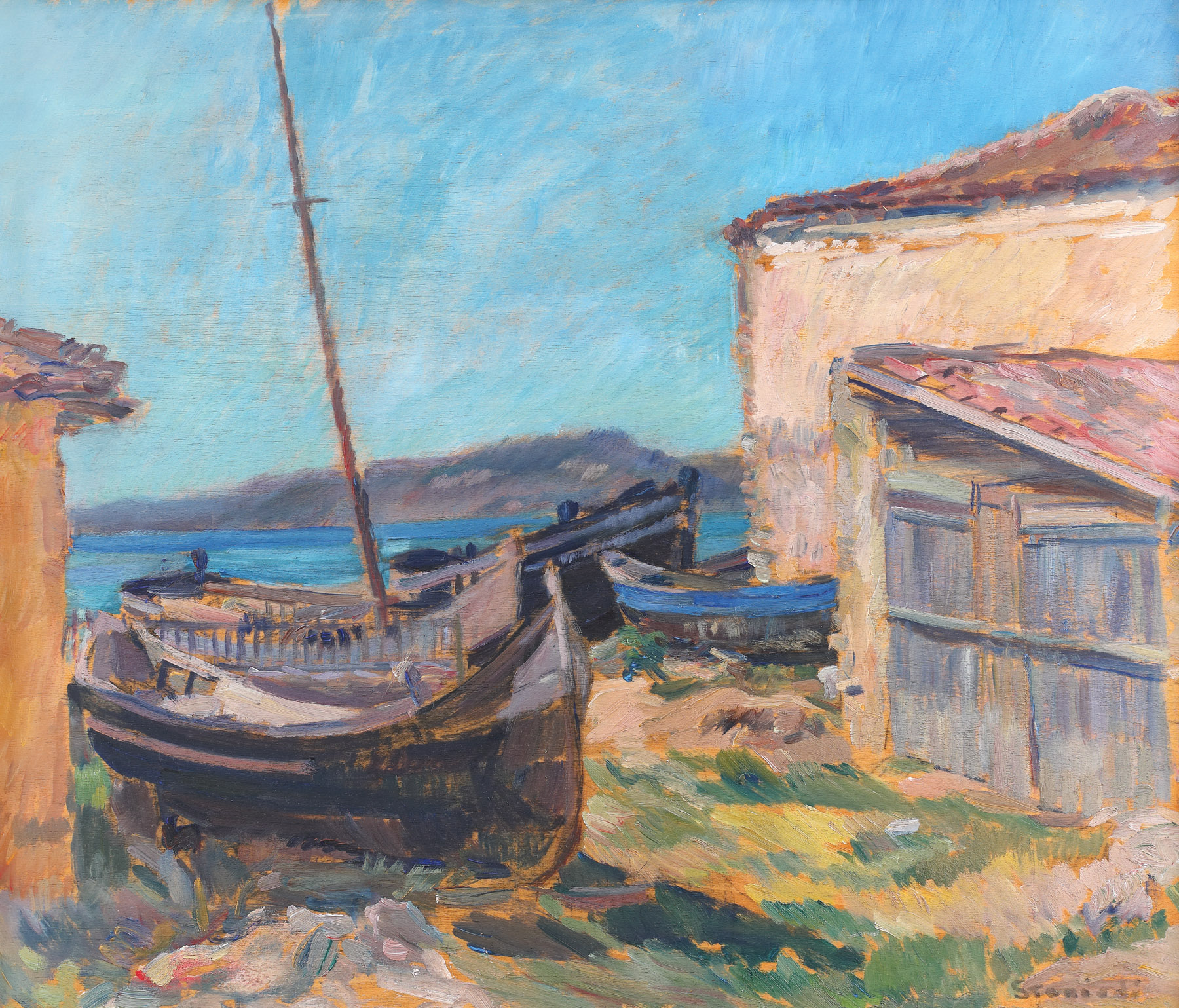 Descoperită la început de pictorii Alexandru Satmary, Iosif Iser, Gheorghe Petrașcu, Ion Theodorescu-Sion sau Ipolit Strâmbu(lescu), Dobrogea se impune în arta românească la începutul perioadei interbelice prin așezările sale cu personaje și obiecte, figurate în lumini orbitoare, reflectate de straturi geologice răzvrătite și de prezența mării. Numit inițial Cruni și consacrat după antica întemeiere lui Dionysos, zeul al vinului, Balcicul vremurilor moderne reușea să realizeze începând cu anul 1913 o remarcabilă performanță, devenind o fereastră deschisă spre Occident. Abundent de culturi și civilizații, Balcicul a fost admirat de-a lungul anilor prin intermediul diferitelor arte, a căror reprezentanți au reușit să îl cuprindă în toate splendorile și aparențele sale. Steriadi va cunoaște Balcicul în preajma anilor ’20, descoperindu-l cu pătrundere, atât în schițe, cât și în picturi, neratând nimic din ceea ce ar putea fi un subiect încântător. Deseori, pictorul putea fi observat la Cafeneaua lui Mamut, aplecat pe caietul de schițe, creionând figurile celor din jur. În alte zile, atenția sa se apleacă asupra a ceea ce observă în timpul peregrinărilor la pas, precum fântânile, drumurile tătărești, casele povârnite, stâncile, geamia roșie sau mahoanele trase la mal- încărcate de melancolie. Îl vom întâlni la Balcic și mai târziu, în anii ‘30, până spre anii ‘40, timp în care își va însufleți pânzele cu motive precum cele expuse în operele: „Case din Balcic”, „Cartierul tătăresc la amiază”, „Natură moartă cu crap”, „Caliacra”, „Strada principală din Balcic”, „Piața din Balcic” sau „Mahoane părăsite”. (G.M.)