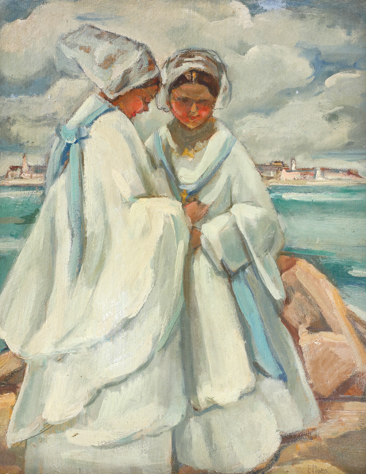 În 1928, Elena Popea ajungea prima dată în Olanda, și înregistra un mare succes cu expoziţia sa personală de la Haga. Popea surprindea prin picturile sale tensiunea şi tumultul vânturilor ce animă continua mişcare a morilor de vânt, culoarea vie a câmpurilor cu flori, precum şi apăsarea străzilor înguste din oraşele cu locuinţe alungite spre cer. Lumina este constant prezentă, cu elementele sale particulare, sugerând nori înalţi ce o propagă fluid în sidefuri de culoare ce definesc forma. Tablourile inspirate artistei de Olanda sunt incluse în rândul celor considerate ca fiind apogeul creaţiei sale. Din această serie face parte şi lucrarea Olandeze, reprezentând două personaje feminine îmbrăcate în haine tradiţionale, încadrate de peisajul specific locului. Se remarcă un contur riguros al volumelor reliefate prin suprafeţe mari de culoare rece şi nuanţe în degradeuri smălţuite. Veşmintele specifice personajelor feminine dau autenticitate atât prin reprezentare, cât şi prin tehnică.