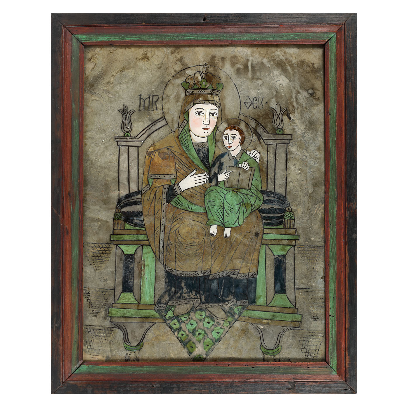 71. Icoană pe glajă, "Maica Domnului cu Pruncul - Împărăteasă", ramă pictată, atelier transilvănean (Laz), începutul sec. XIX, provine din colecția familiei ieșene Leon Sculy Logotheti