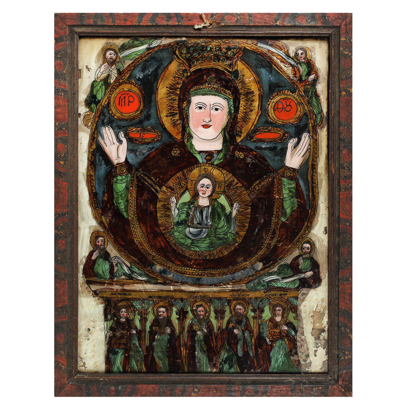 83. Icoană pe glajă, ”Maica Domnului Orantă", ramă pictată, atelier transilvănean (Făgăraș), prima jumătate a sec. XIX, piesă rară, provine din colecția muzeologului Alexandru Marinescu