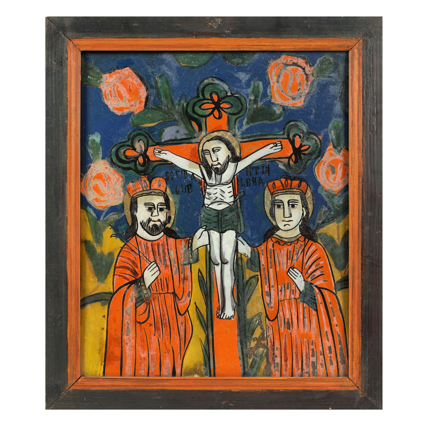 61. Icoană pe glajă, ”Sfinții Împărați Constantin și Elena”, ramă pictată, atelier transilvănean (Nicula), jumătatea sec. XIX, provine din colecția familiei ieșene Leon Sculy Logotheti