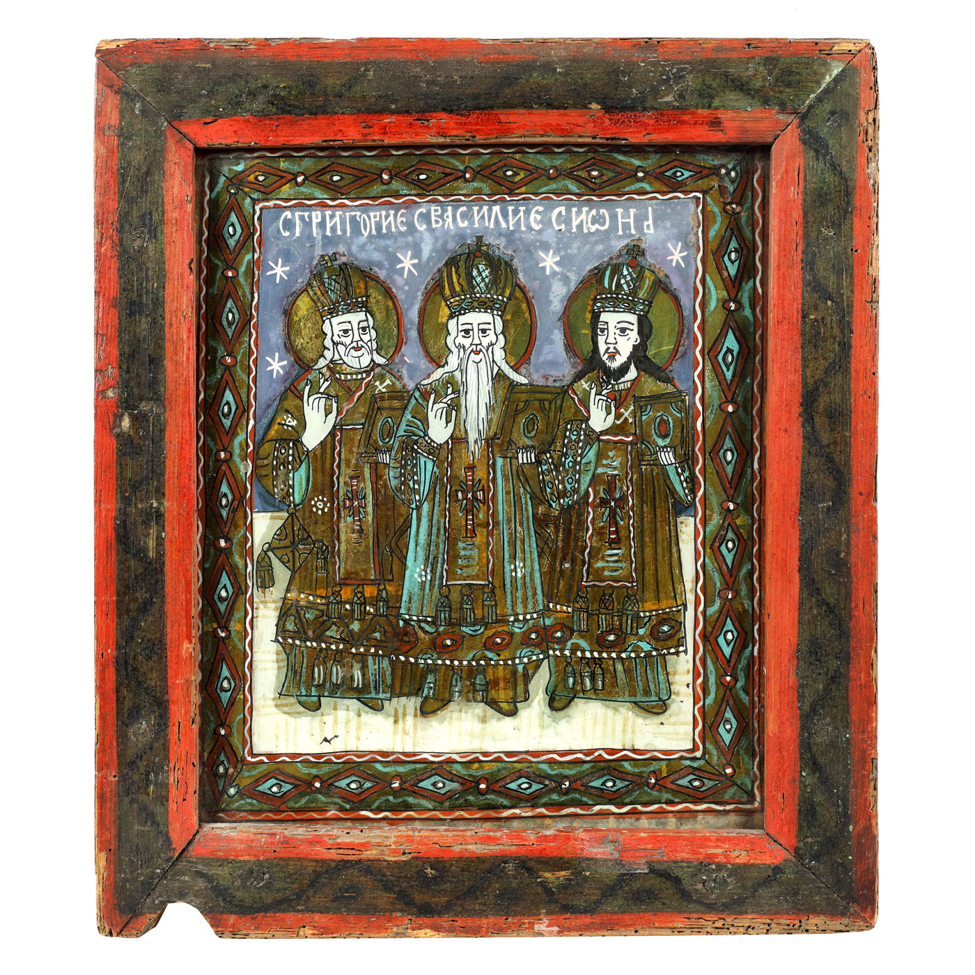 84. Icoană pe glajă, ”Sfinții Trei Ierarhi (Vasile, Ioan și Grigorie)”, atelier transilvănean (Laz), ramă pictată, începutul sec. XIX
