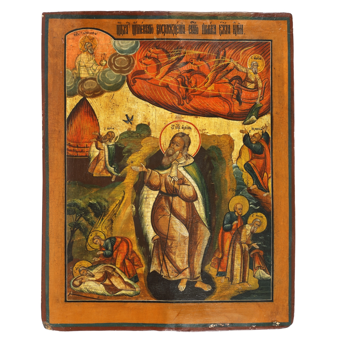 68. Icoană pe lemn, ”Înălțarea la cer a Sfântului Prooroc Ilie și scene din viața sa”, școală rusească (lipovenească), începutul sec. XIX