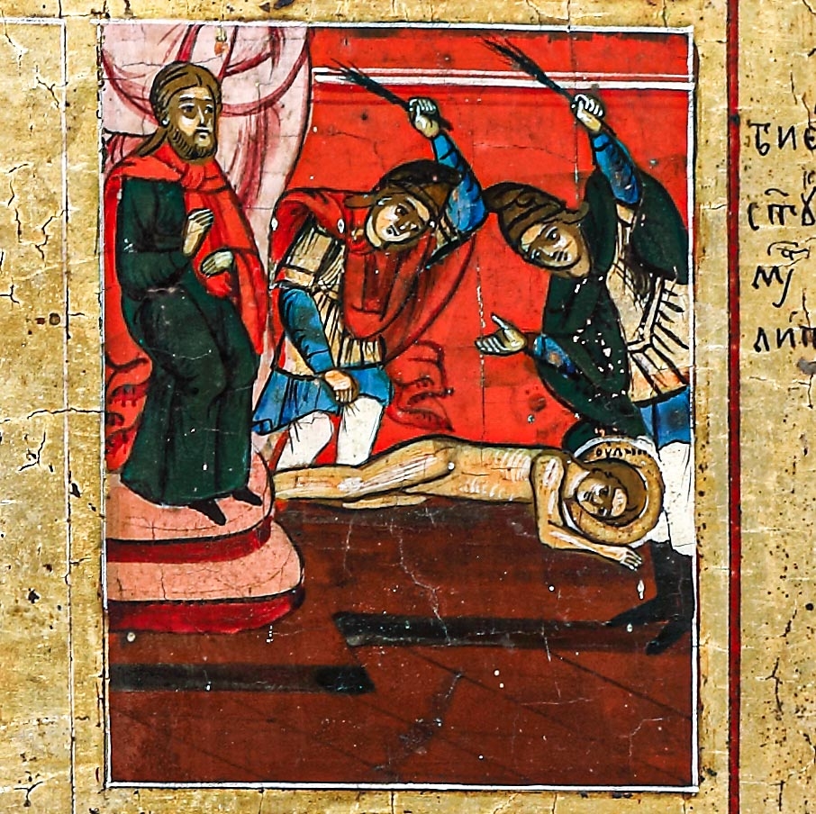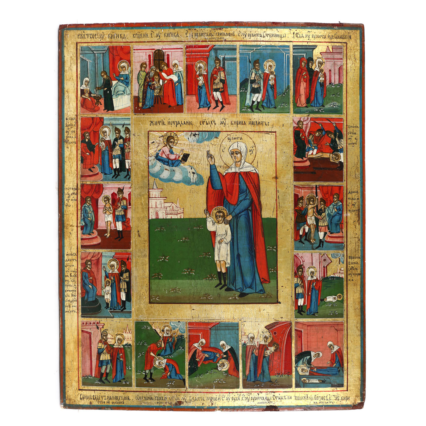 65. Icoană pe lemn, ”Sfânta Muceniță Iulita, Sfântul Chiril și 16 scene din viața și martiriul lor”, școală rusească, jumătatea sec. XIX, piesă rară