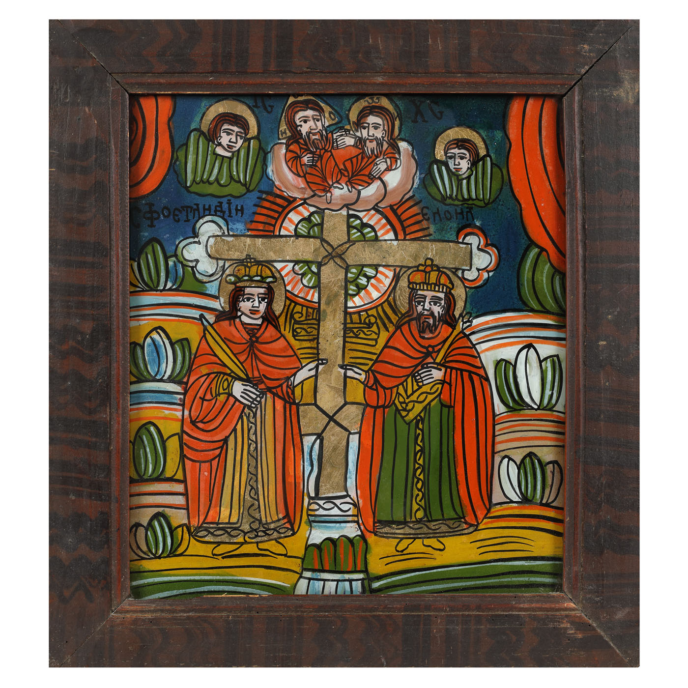 60. Icoană pe sticlă, "Sfinții Împărați Constantin și Elena”, ramă pictată, atelier transilvănean (Gherla), sfârşitul sec. XIX, , provine din colecția muzeologului Alexandru Marinescu