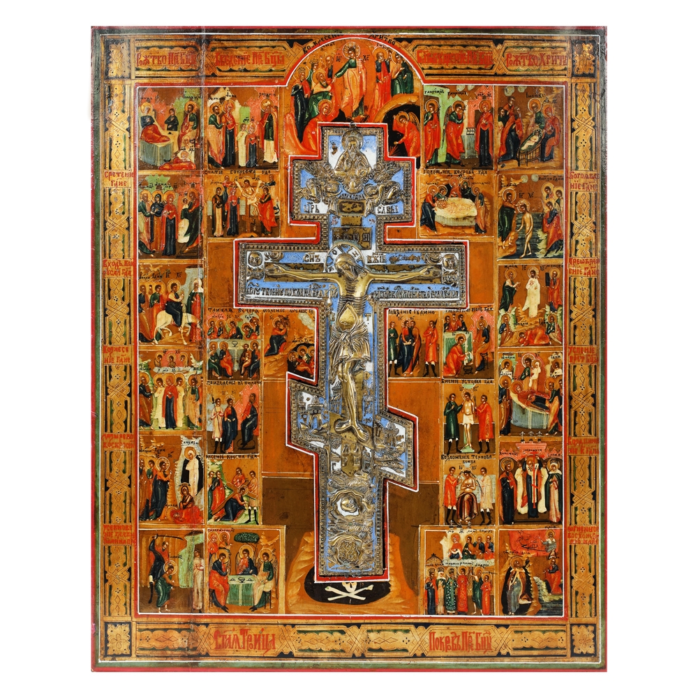 64. Icoană prăznicar pe lemn, ”Iisus Răstignit și 26 de scene din viața Maicii Domnului și a lui Iisus Hristos”, școală rusească, prima jumătate a sec. XIX