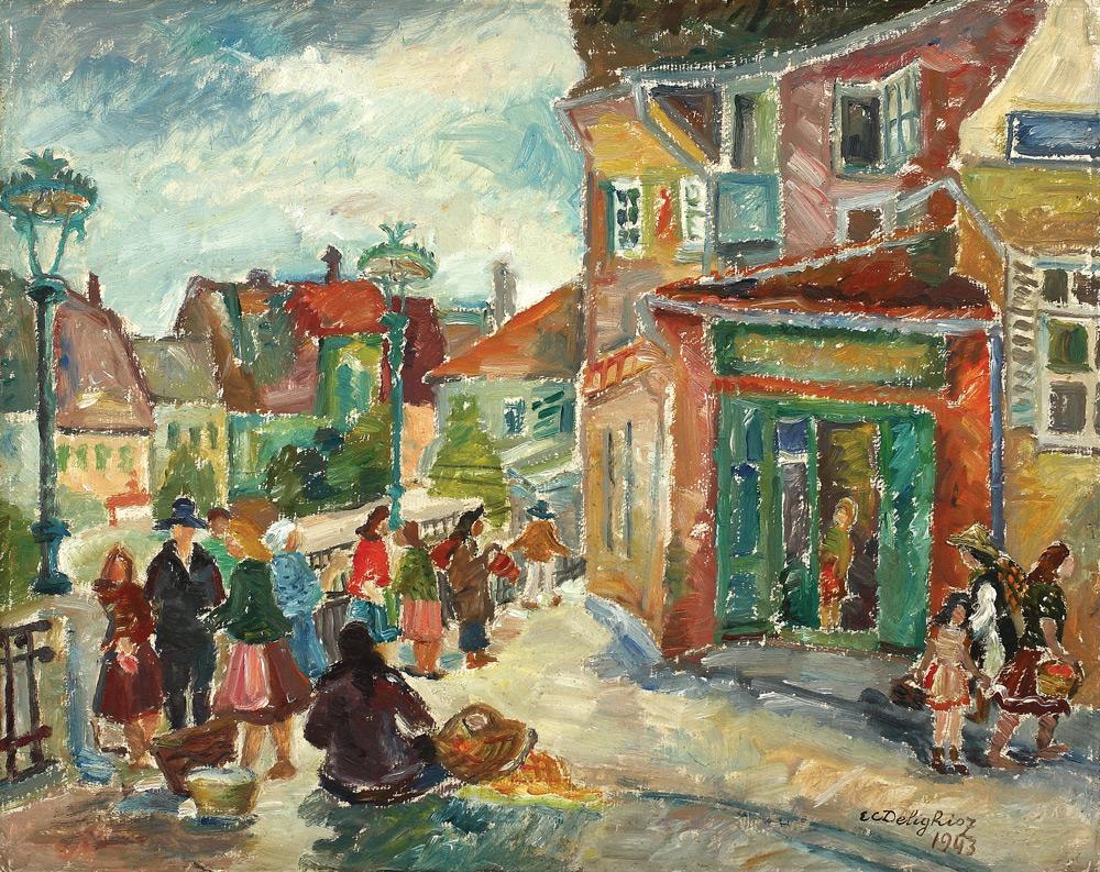 semnat și datat deapta jos, cu brun, E. C. Delighioz, 1943