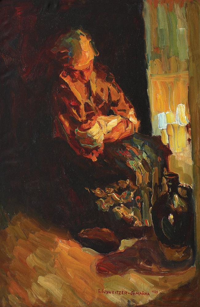 ”E un sbucium în acest suflet cu totul original, capabil de opere mari, un sbucium onest şi fecund. Nimic din ceea ce face nu e ca la alţii, dar nu pentru că o voeşte, ci pentru că e o necesitate absolută a sufletului său (...). De la acest pictor putem aştepta o nouă formulă a realităţilor pământului nostru.” Nicolae Iorga scria aceste cuvinte despre Schweitzer-Cumpăna în 1921 – acelaşi an în care a fost realizată pictura “Maternitate” – când îl remarcase ca fiind o revelaţie pentru mediul artistic românesc, un pictor tânăr ce avea să diversifice, printr-o operă de valoare, viziunea asupra realităţii româneşti. Entuziasmul cu care primea apariţia unei perspective originale venea pe fondul vastei producţii a epigonismului grigorescian, o pictură ce îşi avea izvorul în lirismul agreabil al unui capitol al creaţiei lui Grigorescu. Semnificativă din punct de vedere al prezenţei în arta interbelică, aceasta marca o direcţie în pictură, susţinută de gustul amatorilor ocazionali, în căutarea unui ornament facil pentru decorarea unui interior cu intenţie de reprezentativitate. Recursul la acest izvor, indicat de Amelia Pavel, în studiul său asupra picturii româneşti interbelice, a fost simultan cu apelul la tradiţia artistică populară, pe linie folclorică sau religios-bizantină, în direcţia găsirii şi exprimării specificului naţional în artă. Această orientare tradiţionalistă a fost îmbrăţişată şi de Schweitzer-Cumpăna, în a cărui concepţie artistică se conjugau influenţele curentelor noi din arta europeană. Studiile pe care le-a urmat la Academia Regală de Arte Frumoase din Berlin şi-au spus mai puţin cuvântul asupra creaţiei sale, însă mediul artistic al oraşului, muzeele şi expoziţiile de artă contemporană, prin care a luat contact cu experimentele artei moderne, l-au influenţat hotărâtor. Pictura germană a începutului de secol al XX-lea asimilase impresionismul într-un mod specific, căutând efecte­­­le luminii fără a renunţa în totalitate la clarobscurul de descendenţă neoclasică. Astfel, Al. Busuioceanu se referea la “impresionismul münchenez”, cu contrastele, umbrele şi “efectele (lui) excesive”, pe care Schweitzer-Cumpăna îl dobândise şi care se manifesta în lucrările lui de început. Atmosfera gravă a picturii “Maternitate” este subliniată de folosirea unei chei joase de iluminare, în care predomină tonurile întunecate şi umbrele puternice şi apar zone restrânse puternic luminate. În încăperea sugerată prin absenţa luminii, o femeie şi pruncul său sunt redaţi într-un moment de duioasă apropiere, însă pacea nu pare a se răsfrânge şi în jurul lor. Cu o privire atentă asupra realităţilor vieţii, Schweitzer-Cumpăna nu evită să înfăţişeze aspectele dure ale existenţei satului românesc, într-o perioadă în care situaţia ţărănimii era critică, iar o mare parte din artă ignora problemele, prezentând viaţa oamenilor într-o aură idilică de suficienţă. Vicisitudinile sunt simbolizate aici prin izolarea figurilor într-un spaţiu umil, care poate fi asociat cu o casă doar prin vasul alăturat, unde soarele răzbate să evidenţieze calităţile morale ale omului simplu. Un portret al femeii de la ţară învestite cu caracter eroic – personaj neindividualizat, emblematic pentru o întreagă clasă socială - “Maternitate” este o imagine pătrunzătoare din galeria de portrete de ţărani a pictorului. Mai mult decât particularităţile tehnicii sale picturale, a tuşelor vibrante încărcate de pastă, gestul rapid şi cromatica exaltată, opera lui Schweitzer-Cumpăna se face remarcată prin concepţia profund umanistă care se află la originea sa.