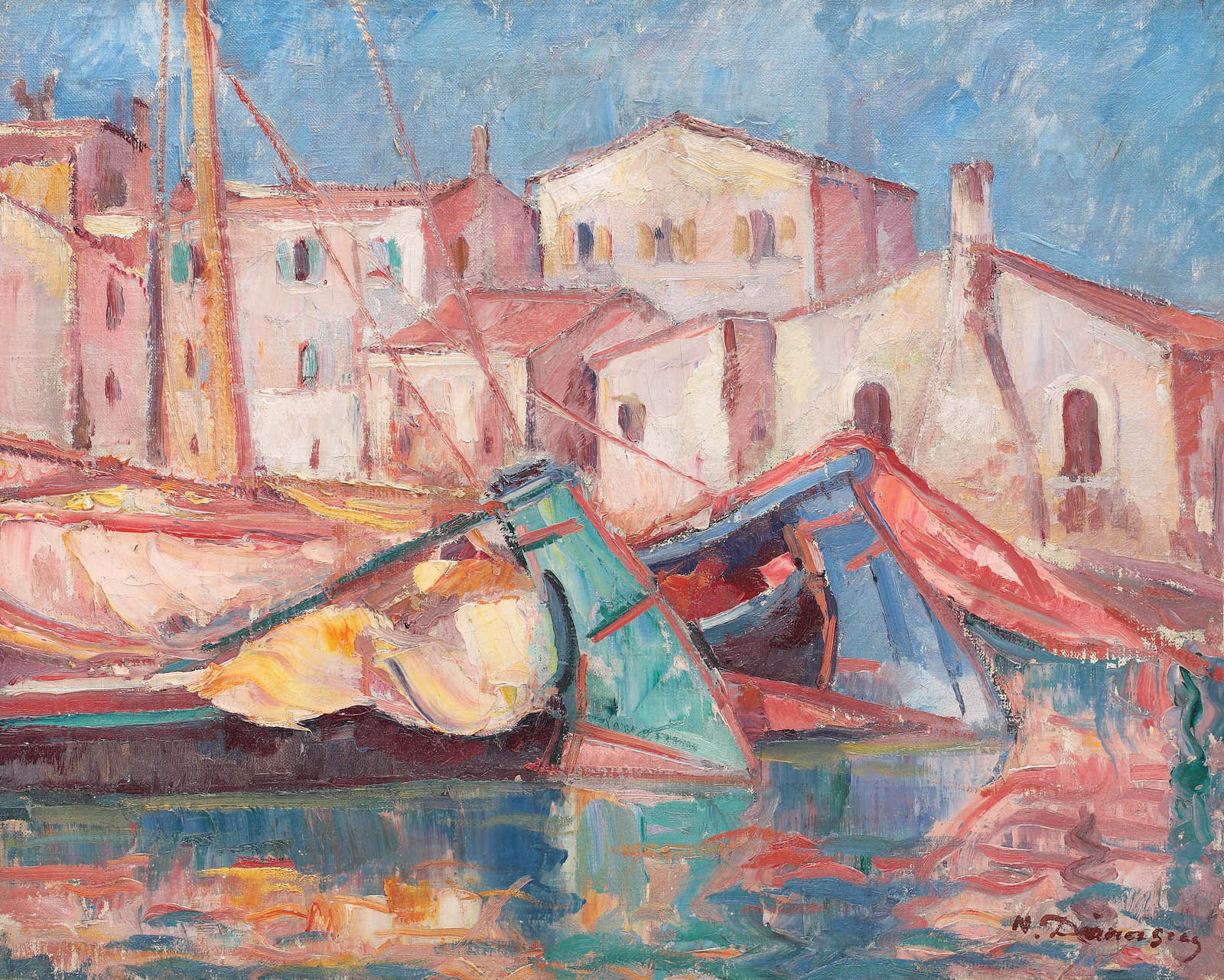 Apariția unei picturi de Nicolae Dărăscu trezește instinctiv o vioiciune cromatică probabil unică în peisajul picturii românești moderne, de la Grigorescu până la Ciucurencu, cu atât mai mult cu cât discursul se axează pe maeștri ai impresionismului și postimpresionismului autohton. Dincolo de evidentul figurativ care îl plasează printre primele trepte ale acestui subiect atât de larg abordat de artiștii români, și biografia pictorului îl îndreptățește pe acesta să umple multe pagini în critica artistică dedicată acestor curente. Chiar dacă studiile le începe sub aripa marilor profesori de la Belle Arte de la începutul secolului XX, în persoana lui G.D. Mirea sau a lui I. Strâmbu, prima revelație pe care Dărăscu o are în plan pictural se petrece odată cu vizionarea expozițiilor lui Luchian (Casa Assan, 1902), Petrașcu sau Nicolae Grigorescu (Ateneu, 1904). Descoperirea unui impresionism atât de personal al celor trei menționați - integrându-l în acest curent și pe Petrașcu, tributar influenței grigoresciene în primul deceniu al secolului XX, - se va concretiza în anii petrecuți la studii în Paris. Academia Julian, ulterior Academia de Beaux-Arts nu îi vor oferi răspunsuri în ceea ce privește tehnicile impresioniste, însă ieșitul la peisaj, experimentul și mai ales întâlnirea cu neoimpresioniștii îi vor deschide orizonturi inedite. Cam în aceeași perioadă în care și Mutzner, Ressu sau Sion experimentau tehnica de pictură divizionistă (1908-1912), Dărăscu își însușea un bagaj tehnic excepțional, sub influența operei lui Seurat, Signac, Cezanne sau Monet. Exercițiul călătoriei și descoperirea locurilor propice sau inedite luau naștere la începutul deceniul doi, când Dărăscu picta în sudul Franței (St. Tropez, Grimaud, Ramatuelle), în Italia (Veneția) sau în țară (ex. Vlaici). Prima călătorie pe care Dărăscu o întreprinde în nordul Italiei, la Veneția și Chioggia, se consuma în jurul lui 1910, aceeași perioadă în care Gheorghe Petrașcu descoperea și el vedutele lagunare. Pentru o perioadă de mai bine de 25 de ani, artistul iniția astfel, asemeni colegului de generație, ciclul dedicat canalelelor, lagunelor, piețelor și ponturilor Veneției și Chioggiei, etapă în care pictura i s-a modelat și definitivat sub imperiul culorii. În interbelic, Dărăscu dedică o bună parte a verilor vizitelor în Italia, una dintre cele mai importante călătorii consumându-se în cursul anului 1926, itinerar materializat un an mai târziu în expoziția intitulată “Veneția”, moment ce îl propulsa în elita peisagiștilor. Opera de față se integrează lesne în seria “venețiilor” realizate de Dărăscu între 1926 și 1933, marcând totodată și concretizarea unui stil inconfundabil, influențat profund de atmosfera, cromatica și peisajul marin oferit de orașul italian. (I.P.)