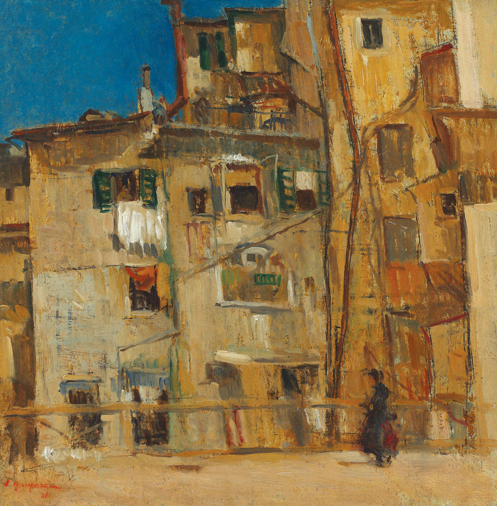 semnat şi datat stânga jos, cu roşu, L. Grigorescu, (19)21; localizat pe verso, Case via Ripetta (Roma)