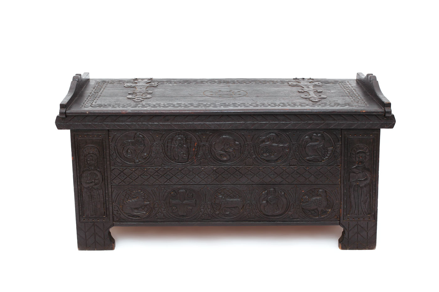 De formă paralelipipedică, cu picioare scurte în consolă, cu panoul frontal decorat cu medalioane circulare reprezentând animale fantastice și sfinți în două registre, montanți cu decor - personaje biblice, sfinți sau martiri, capac cu friză - brâu vegetal, central - medalion incizat cu motive rozete, feronerie masivă - floare de crin.