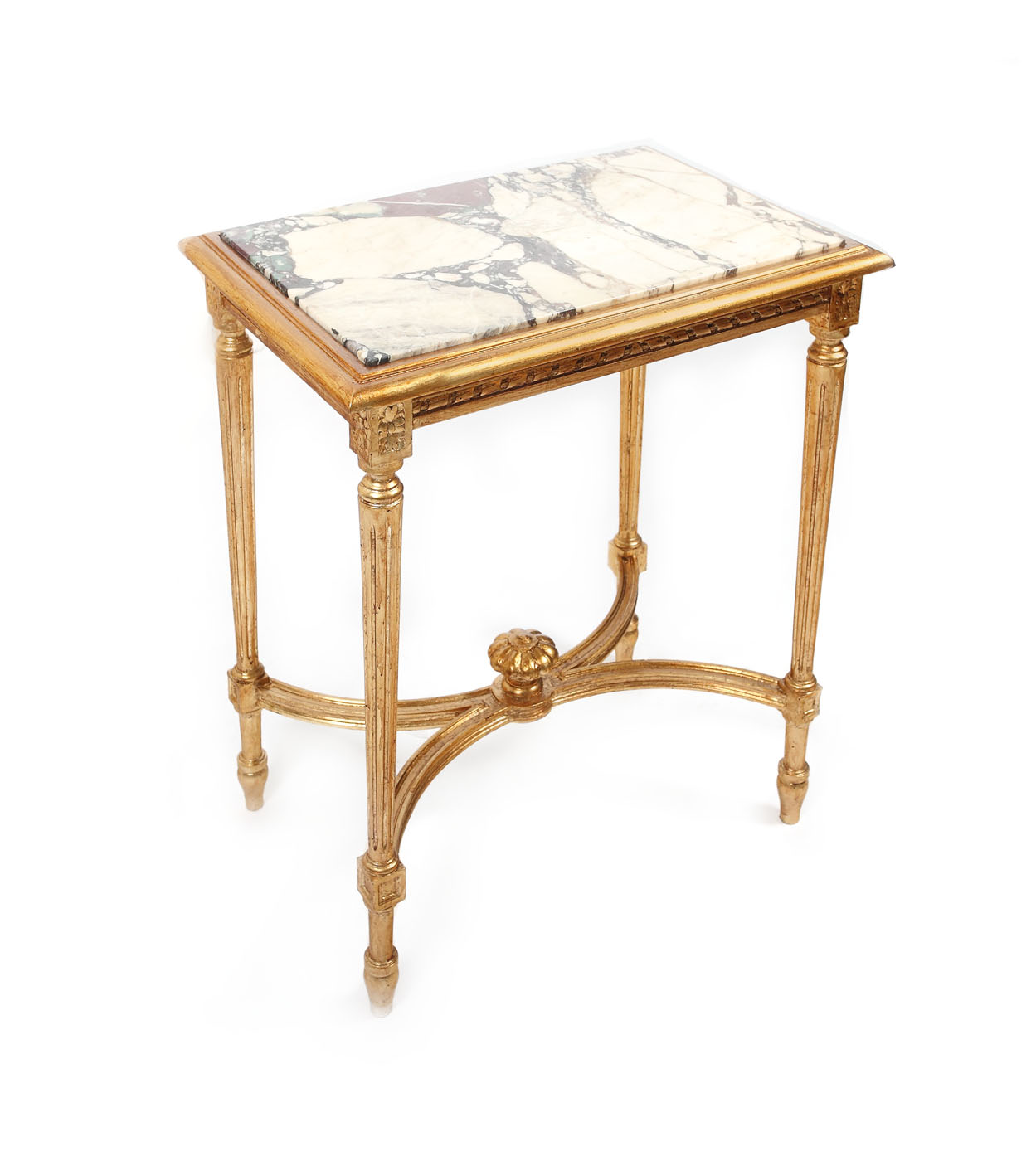 Măsuță pentru salon, din lemn de tei aurit, pe 4 picioare canelate, unite cu traverse rotunjite în "X", blat dreptunghiular cu placă din marmură alb-gri-lila, centură cu friză ruban și motive florale în cartușe.